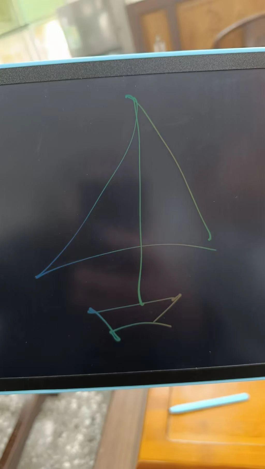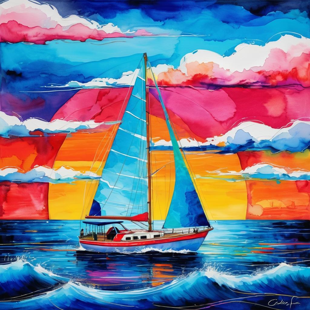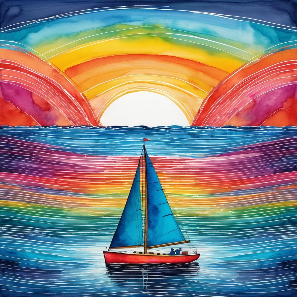 这幅作品是一幅简单的线条画,描绘了一艘帆船。使用了多种颜色的线条,包括蓝色、绿色和黄色,构成了船体和帆的基本形状。整体构图简洁,强调了物品的轮廓和形状。作品传达了一种轻松、自由的情感,仿佛在表达对大海的向往。