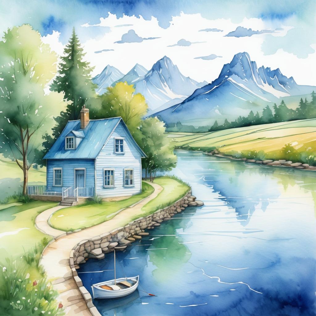 这幅作品用简单的线条勾勒出了一座房屋、一条蜿蜒的河流和一艘帆船,整体色调柔和,包含蓝色和绿色。画面传达了一种宁静的乡村或海边生活的意境,表达了自然与人类居住环境的和谐关系。