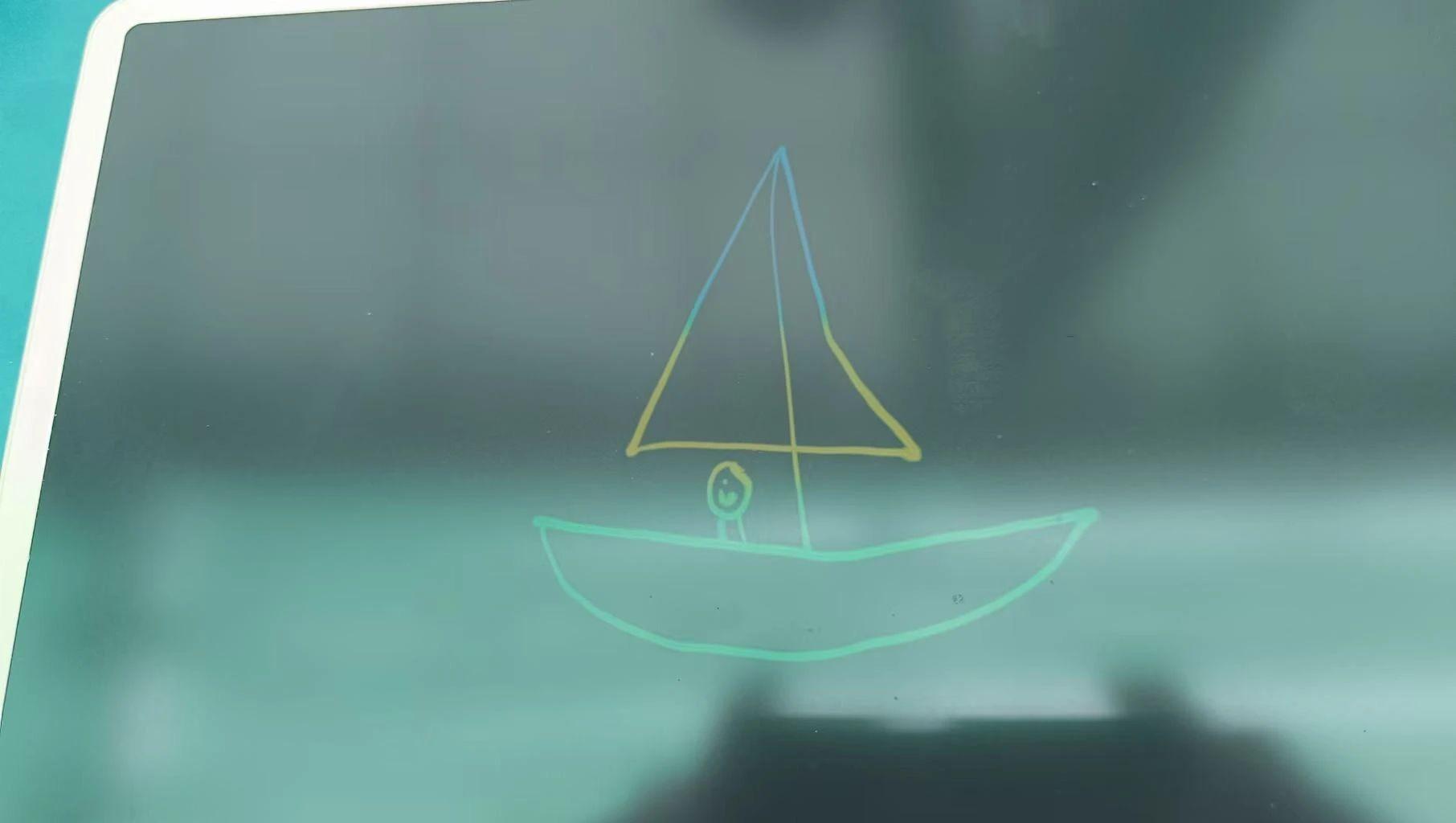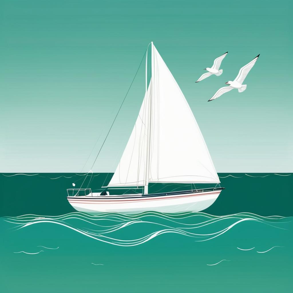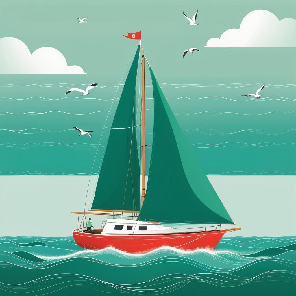 这幅画展示了一艘简单的帆船,上面有一个微笑的人物。使用了简单的线条和渐变色彩,背景是柔和的绿色。这种极简风格可能传达了一种宁静和自由的感觉,可能是对大海和航行的童真的表达。