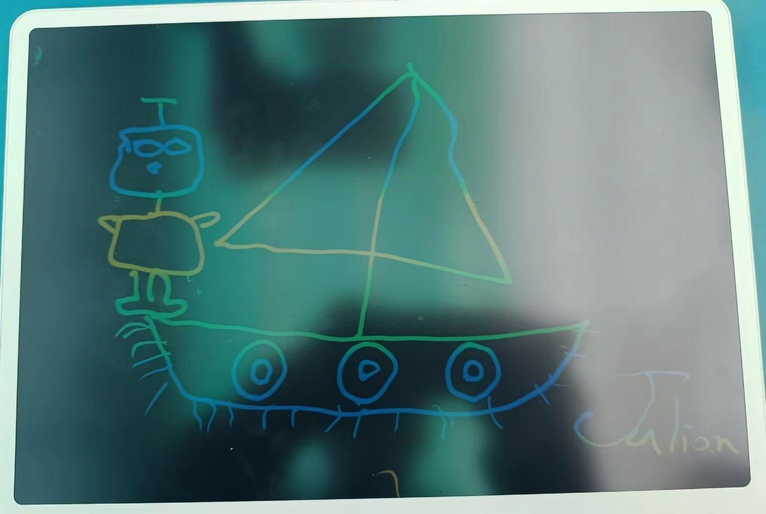 在这幅充满童趣的画作中,我们看到了孩子们天马行空的想象力和创造力。画中的机器人和帆船是冒险精神和探索欲望的象征。明亮的色彩和简单的线条不仅带给观众视觉上的愉悦,也让我们重新回忆起孩童时期的无忧无虑。在欣赏这幅作品时,我们可以思考如何通过艺术来启发孩子们的创造力。建议在此基础上添加一些背景元素,如天空和海洋的色调变化,这样可以使画面更为丰富。同时,通过增加细节,如波浪和云朵,不仅可以增强画面的故事性,也能激发孩子们对周围世界的好奇心。在艺术教育中,让孩子们通过绘画表达自己的内心世界是一种有效的方式。这幅作品在其简约和天真的表达中,蕴含着深刻的意义,值得我们细细品味。