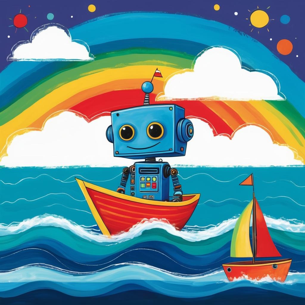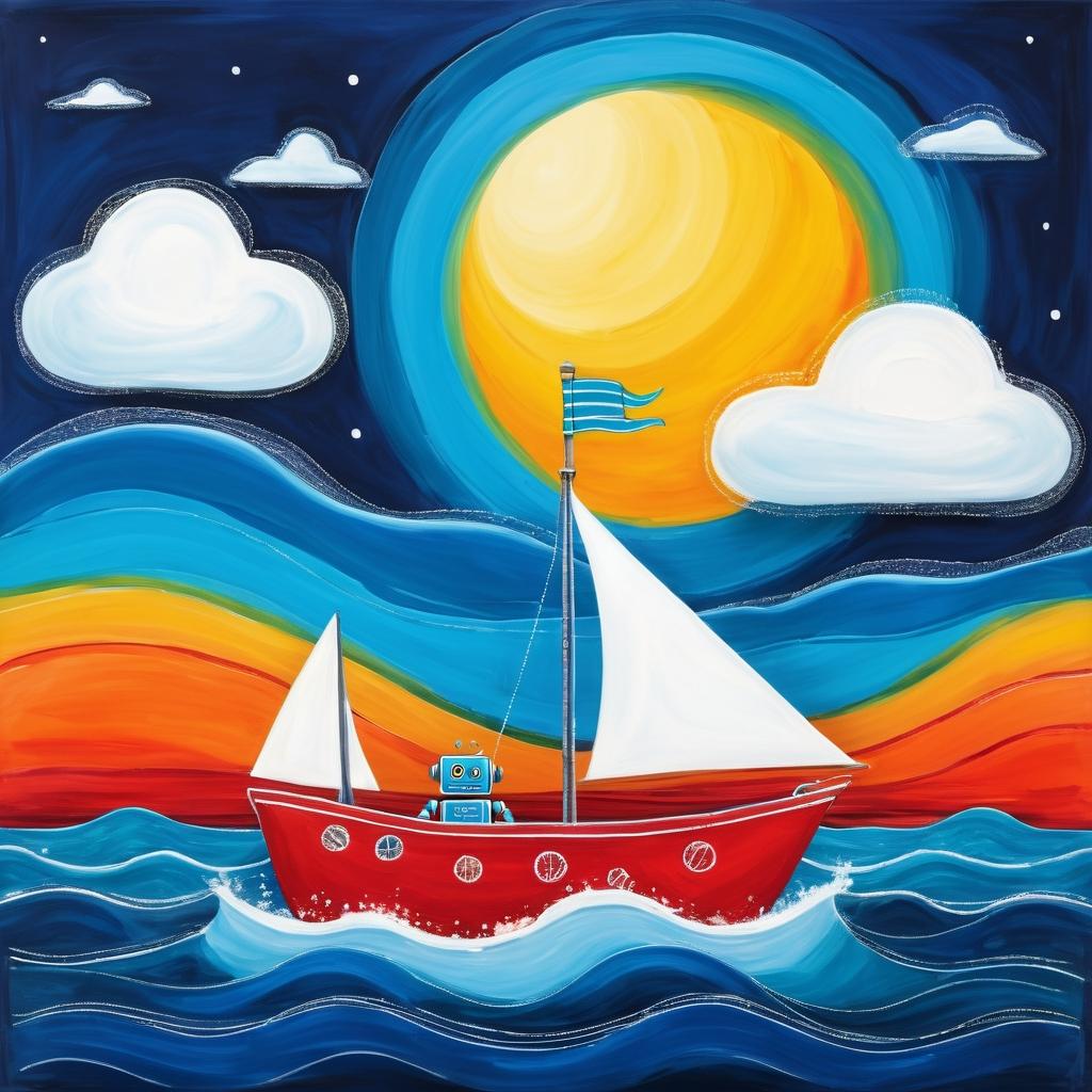 这幅作品是一幅简约的儿童画,运用了明亮的颜色和简单的形状。画中有一个机器人和一艘帆船,表现了一种天真的想象力和创造力。色彩的运用和线条的组合传达了一种轻松和愉悦的情感。