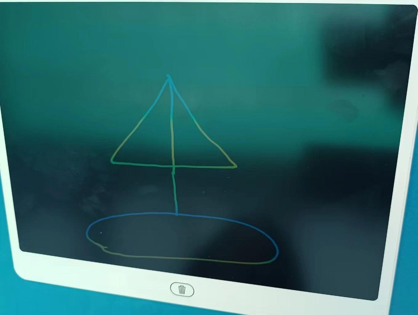 图片中可以看到一个简单的线条绘画,描绘了一艘帆船。背景是绿色的,画面中主要使用了蓝色和黄色的线条。这种极简风格传达了一种纯粹和简洁的美学,可能意在唤起对大海和航行的简单快乐的联想。