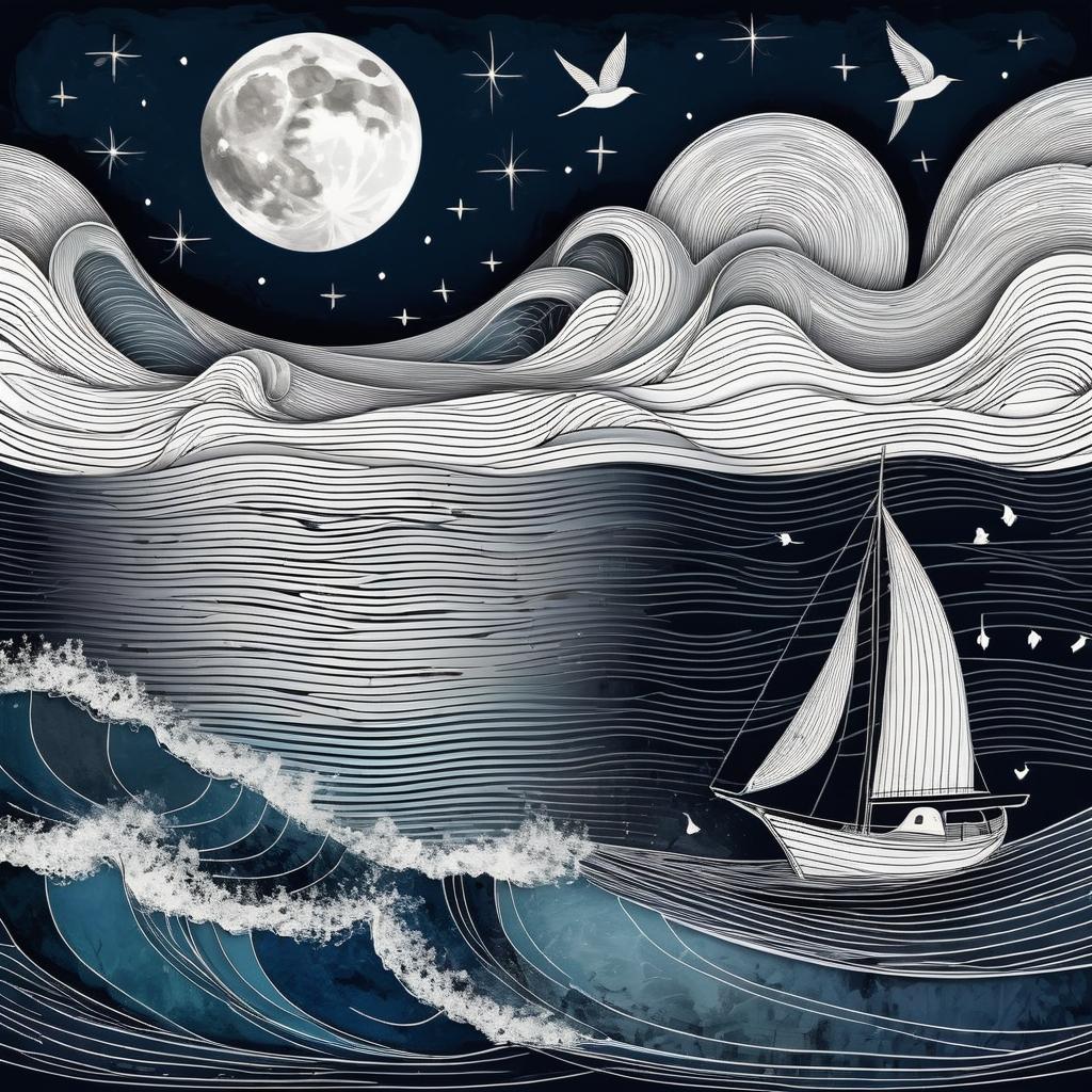在这幅充满童趣的线条画中,简单的线条构建出一幅宁静而富有冒险精神的海上场景。画中,一艘小船在平静的海面上航行,背景是一轮弯月和几只正在飞翔的海鸟。这种作品的魅力在于其纯粹的表达方式,以及通过简单的元素唤起观者内心深处对自然的向往和对自由的渴望。