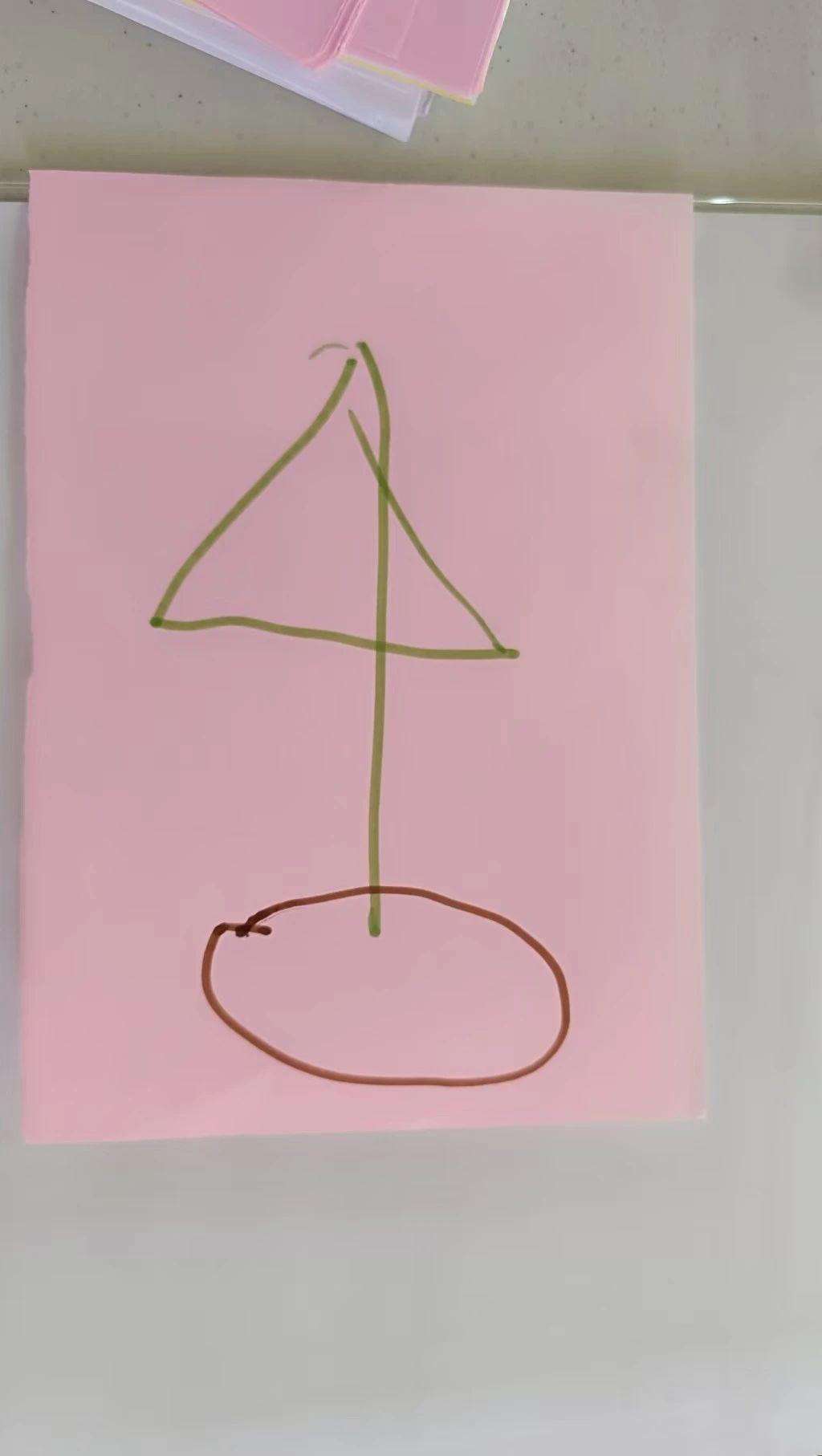 这幅作品展示了一张粉红色背景纸上的简单线条构图。绿色的线条形成了一个类似于树的形状,底部有一个棕色的椭圆形,可能代表根或底座。整体构图简单,色彩对比柔和,给人以宁静和自然的感觉。创作者可能试图表达一种回归自然或生命生长的主题。