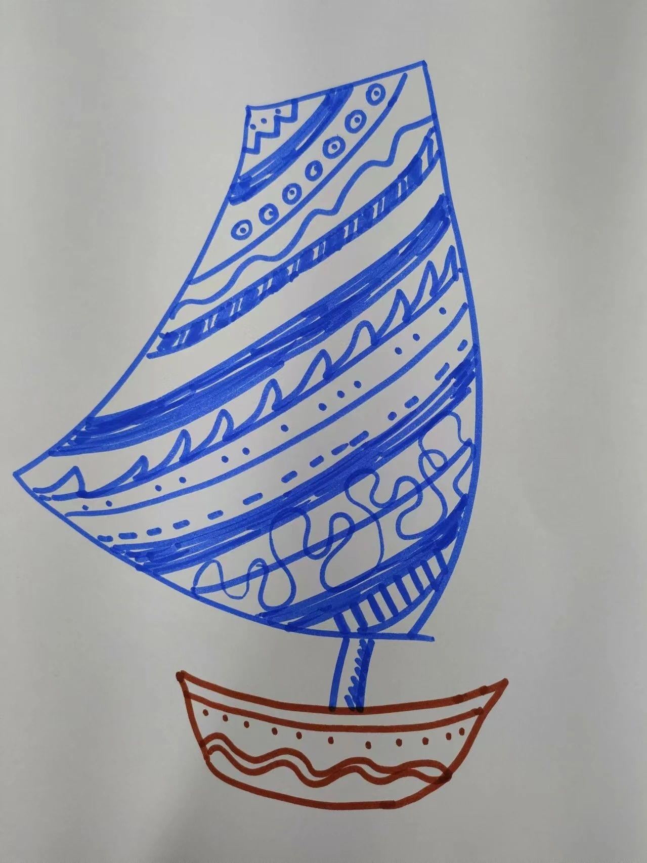 这幅作品是一幅手绘的船,使用了简单的线条和几何图形。帆和船体采用了不同的颜色,蓝色和棕色,形成鲜明对比。帆上的图案丰富多样,包括波浪、圆点和锯齿线,增添了趣味性和动感。整体风格简洁,可能旨在表达一种轻松愉快的情感。