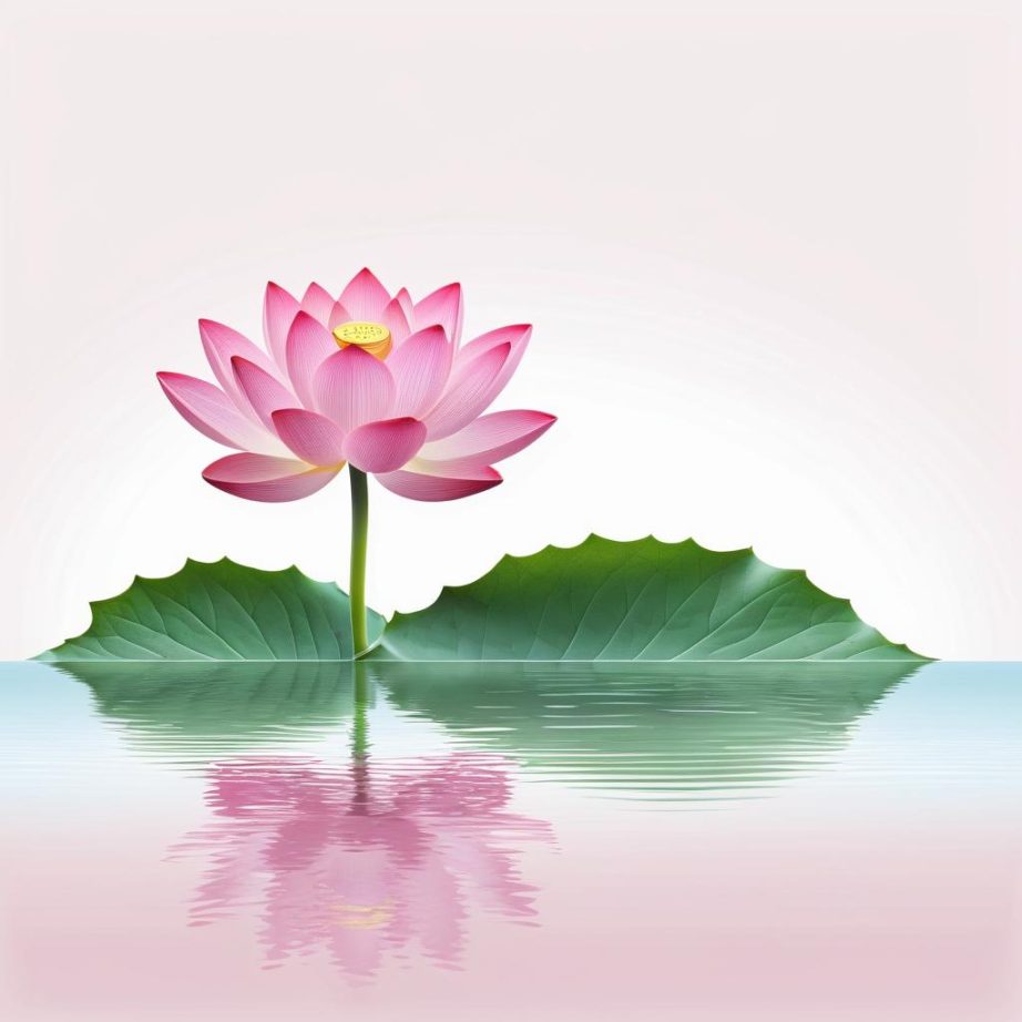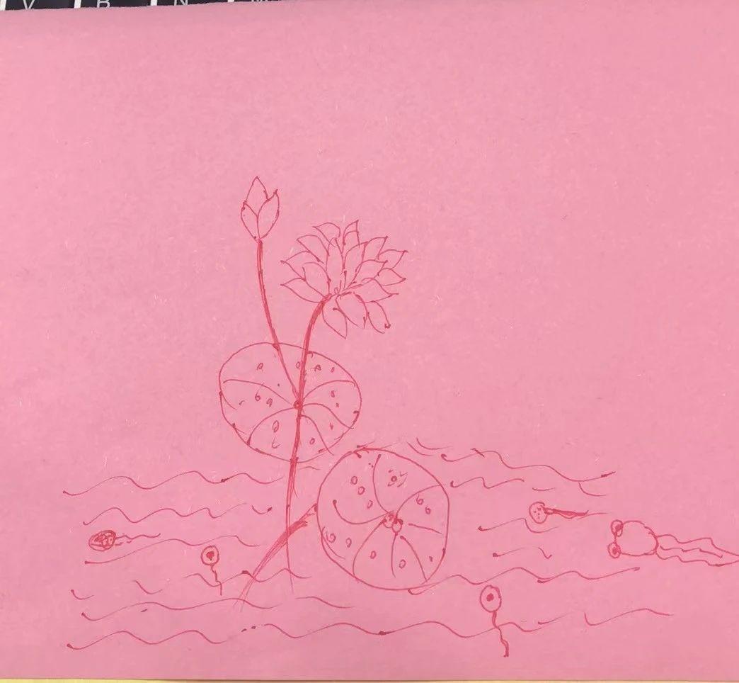 这幅画采用单色调的粉色背景,简单的线条勾勒出一朵莲花和几片荷叶,水面上有几条小鱼游动。整体构图简洁而富有诗意,给人一种宁静的感觉。创作者可能想传达自然的纯净与生命的简单之美。