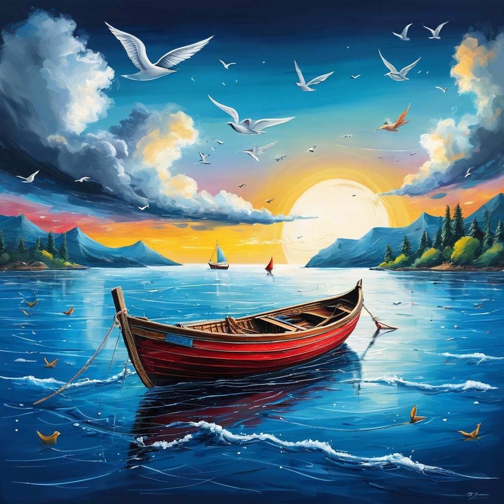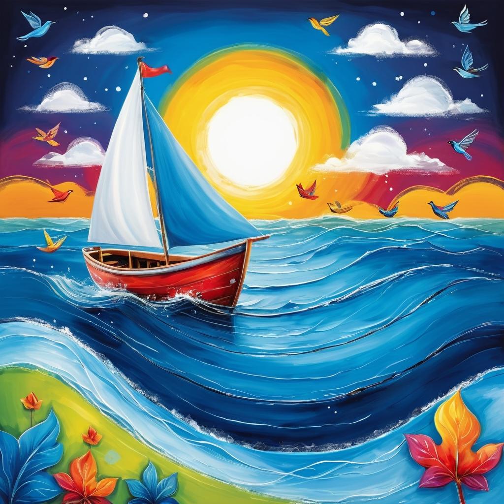 这幅作品通过简单的线条传达了一种纯真和探索的精神。船作为一种载体,象征着冒险和旅行的愿望。为了提升这幅作品的艺术性,可以考虑在背景中加入一些元素,例如海洋的波浪、天空的云朵,或是一些飞翔的海鸟,这样不仅能够丰富画面层次感,还能增强作品的故事性。此外,可以尝试用不同的颜色来为船和帆增添活力,使作品更具吸引力。在构图上,可以考虑将船放置在画面的一侧,留下更大的空间来表现周围的环境,这样能更好地传达出一种航行的感觉。