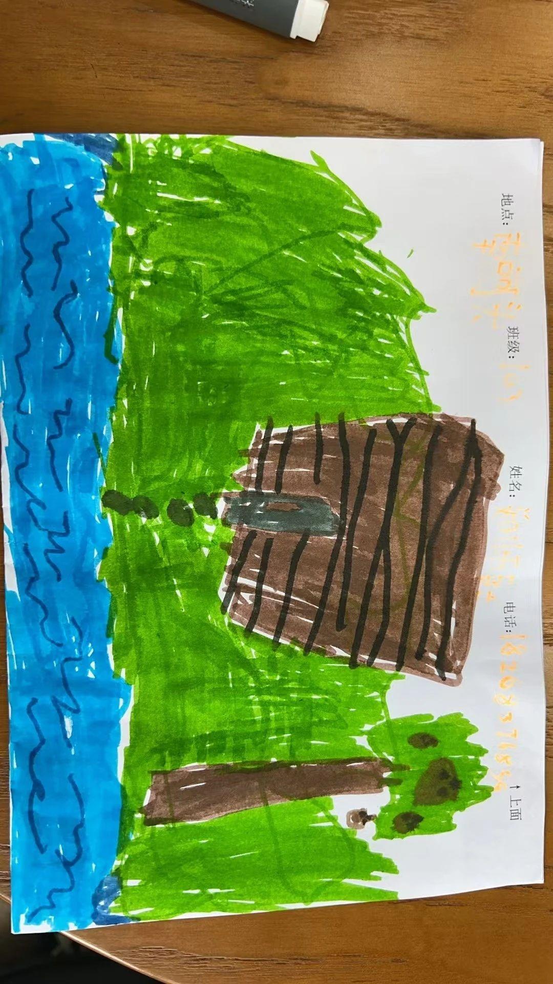 这幅作品是一位儿童的艺术创作,充满了自然的元素和鲜明的色彩。画中描绘了一个小木屋坐落在绿草地上,旁边是一片宁静的蓝色水域。简单明了的构图和鲜艳的颜色让人感受到一种纯真和无邪的情感。这样的作品不仅展示了孩子对自然的热爱和想象力,也让观众领略到自然环境的美丽与宁静。