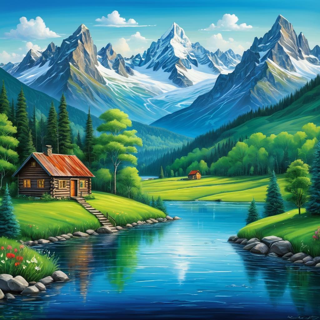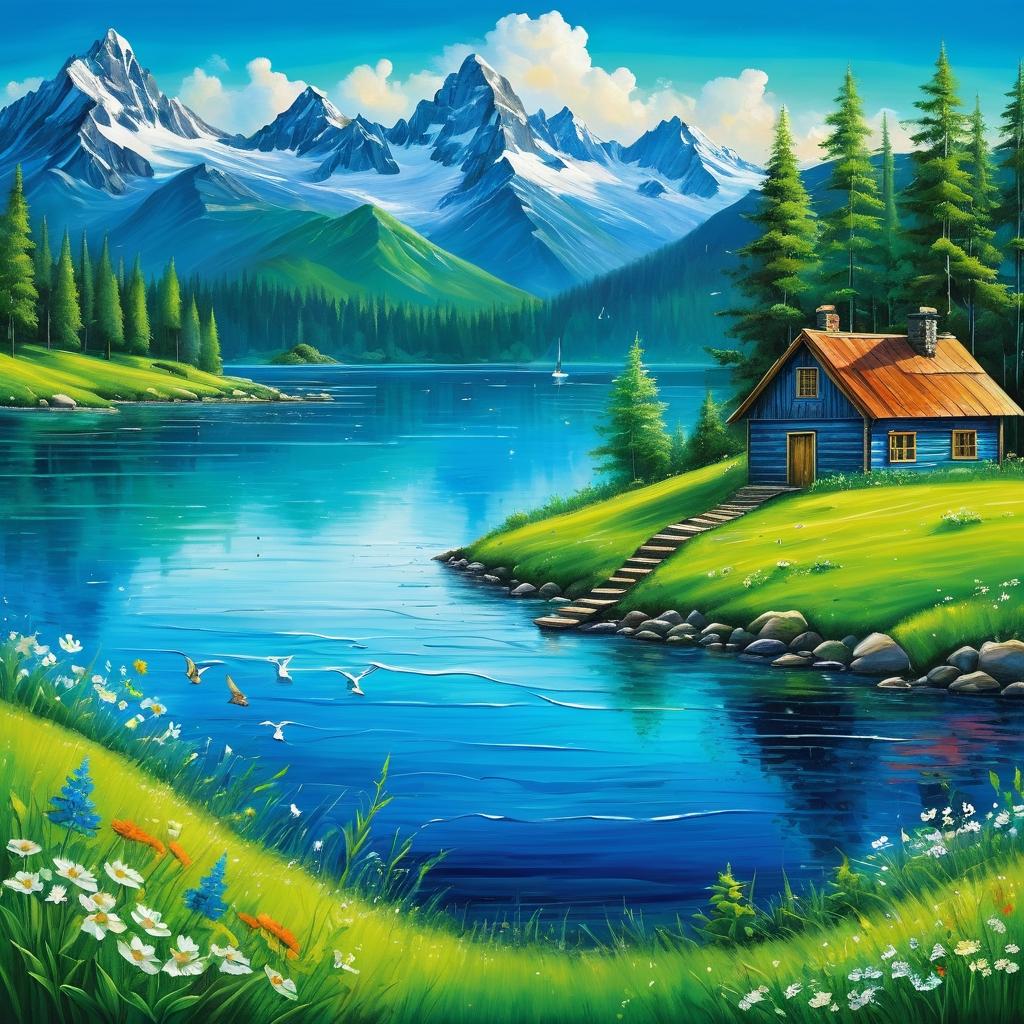 为了进一步提升这幅作品,可以建议创作者在细节上丰富,例如在草地上添加更多的花卉或小动物,使得画面更加生动。此外,可以尝试用不同的蓝色和绿色色调增加深度和层次感,这样不仅能够增强画面的立体感,也能使观众在观赏时有更深的沉浸感。构图上,可以将小屋的细节更加精致化,甚至在背景中加入一些远山或天空的描绘,进一步增强空间感。通过这些调整,这幅作品将更加具有童趣和自然的动感,能够使观众更加深入地感受到大自然的美好与宁静。