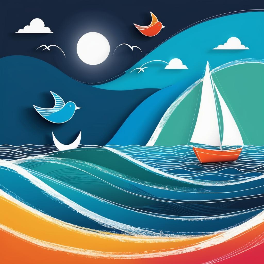 这幅作品通过简单的符号和线条表达了自然与航行的主题。为了增强作品的深度,可以在背景中增加一些渐变色彩,模仿天空和海洋的变化。此外,可以添加更多细节,如船上的人物或动物,以丰富画面的故事性。尝试在风的表现上使用更多的色彩和线条变化,能够更好地传达风力的动感和方向。整体色调可以更加鲜明,以吸引观众的注意力并提升作品的视觉冲击力。