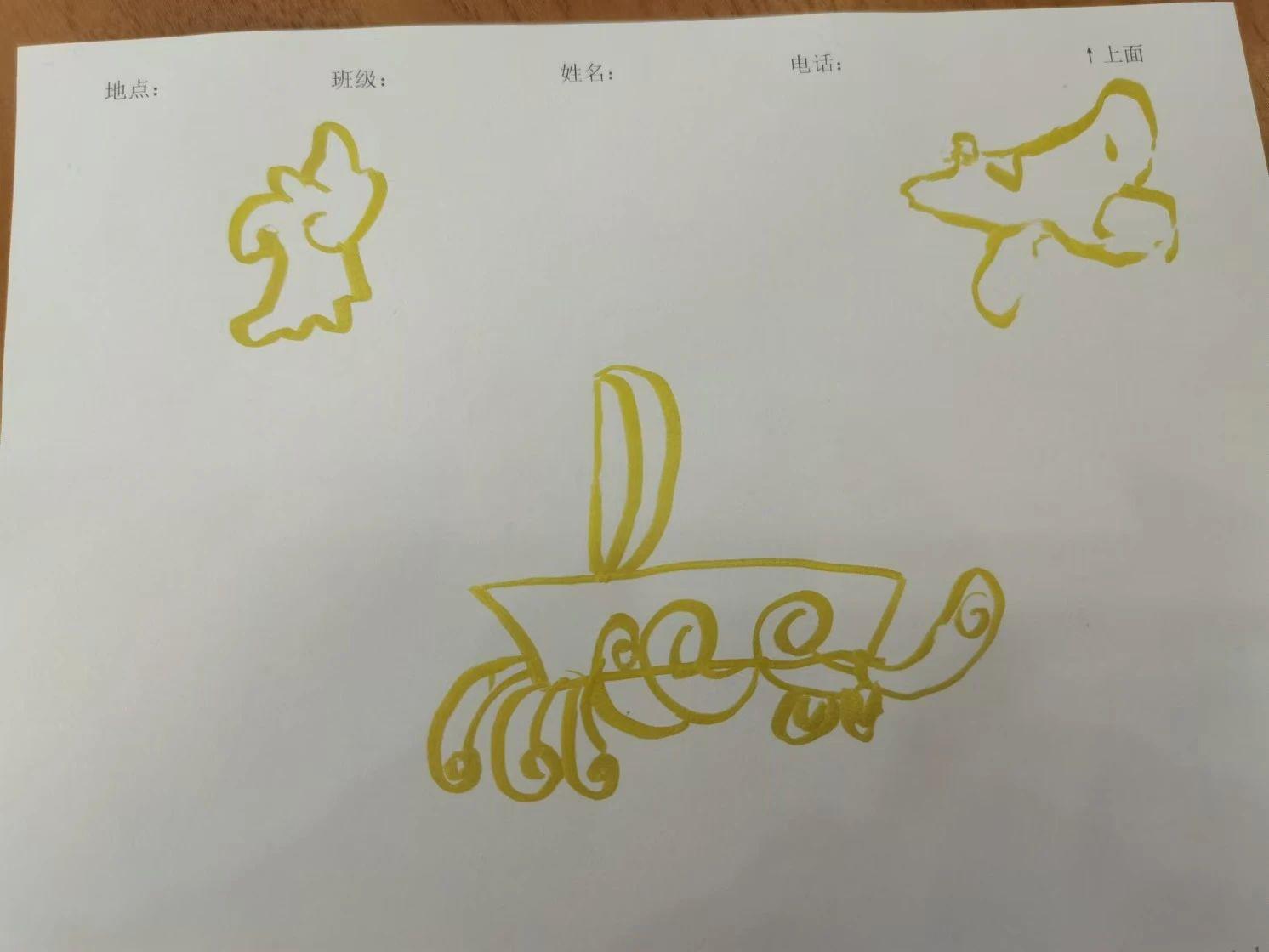 这幅画使用了简单的黄色线条勾勒出几个抽象的形状。中间的形状看似一个带有涡卷装饰的船,左上和右上则是两个不规则的形状,可能代表云朵或飞行的生物。整体缺乏细节,表现出一种天真和无拘无束的风格。