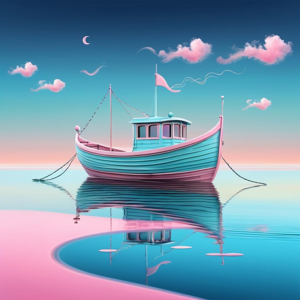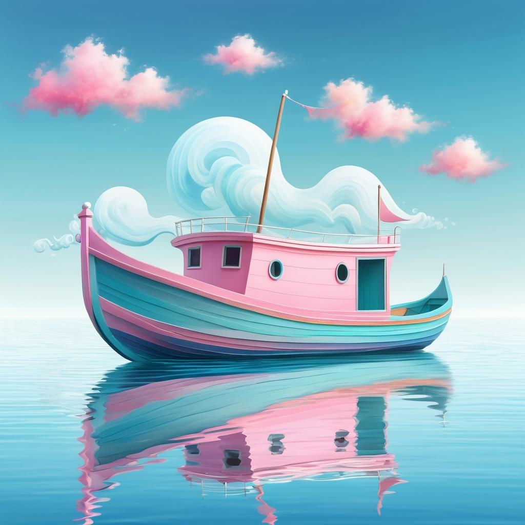 为了让这幅作品更具深度和艺术性,可以考虑加入更多元素和颜色。背景的渐变色可以从浅蓝到淡粉,模拟梦幻的天空。而船周围的波浪能为画面带来动感,增强视觉吸引力。左上和右上的抽象形状可以赋予更多具体特征,使它们更具识别性和故事性。这种丰富的细节将帮助观者更深入地感受作品传达的情感。