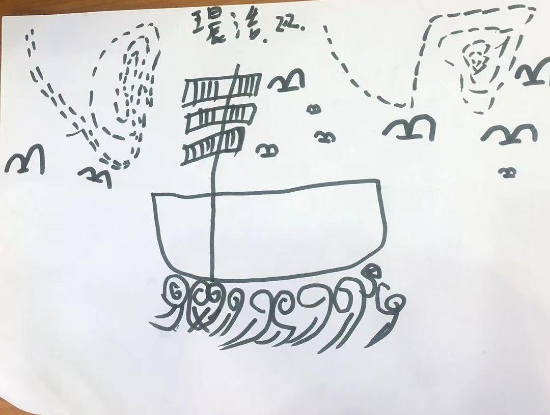 这幅画展示了一艘帆船在海上航行。画面中有简单的线条构成的海浪和帆船,天空中有几朵云朵和风的流动线条。整体风格童趣,线条流畅,表达了一种航行的自由感和冒险精神。创作者可能意在表达探索和勇气。