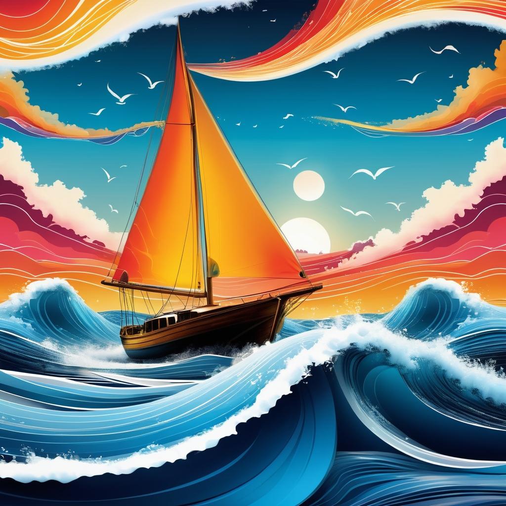 这幅作品以简洁的线条勾勒出一个充满想象力的航海场景。为了提升作品的艺术性,可以在背景中加入更多细节,如日落的色彩变化,增强画面的视觉层次感。增添一些细腻的纹理,如水面的反光效果,可以增加画面的真实感和动感。将风的线条改为更具动感的曲线,使整个画面更富有生命力。通过增加这些元素,作品可以更好地传达出大海的广阔和航行的冒险乐趣。