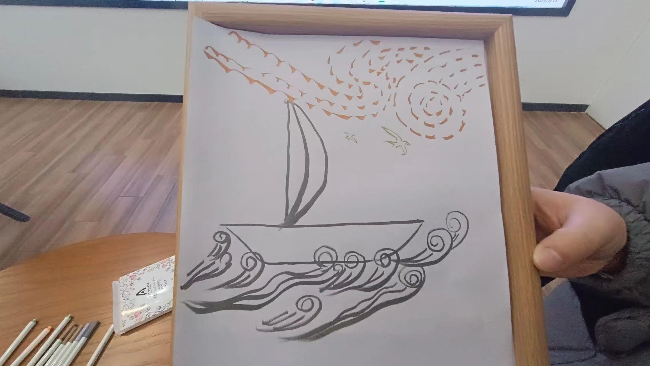 这幅作品以简约的线条勾勒出海洋和天空的元素,传达出一种轻松愉悦的航行体验。可以尝试加入更多的细节,如在船上添加人物或动物,丰富画面的故事性。此外,可以通过颜色的层次和渐变来增强画面的深度感,使得天空的旋涡和水波更具动感和立体感。通过这些调整,可以使作品更具视觉冲击力,同时也能更好地表达创作者的内心世界和情感波动。