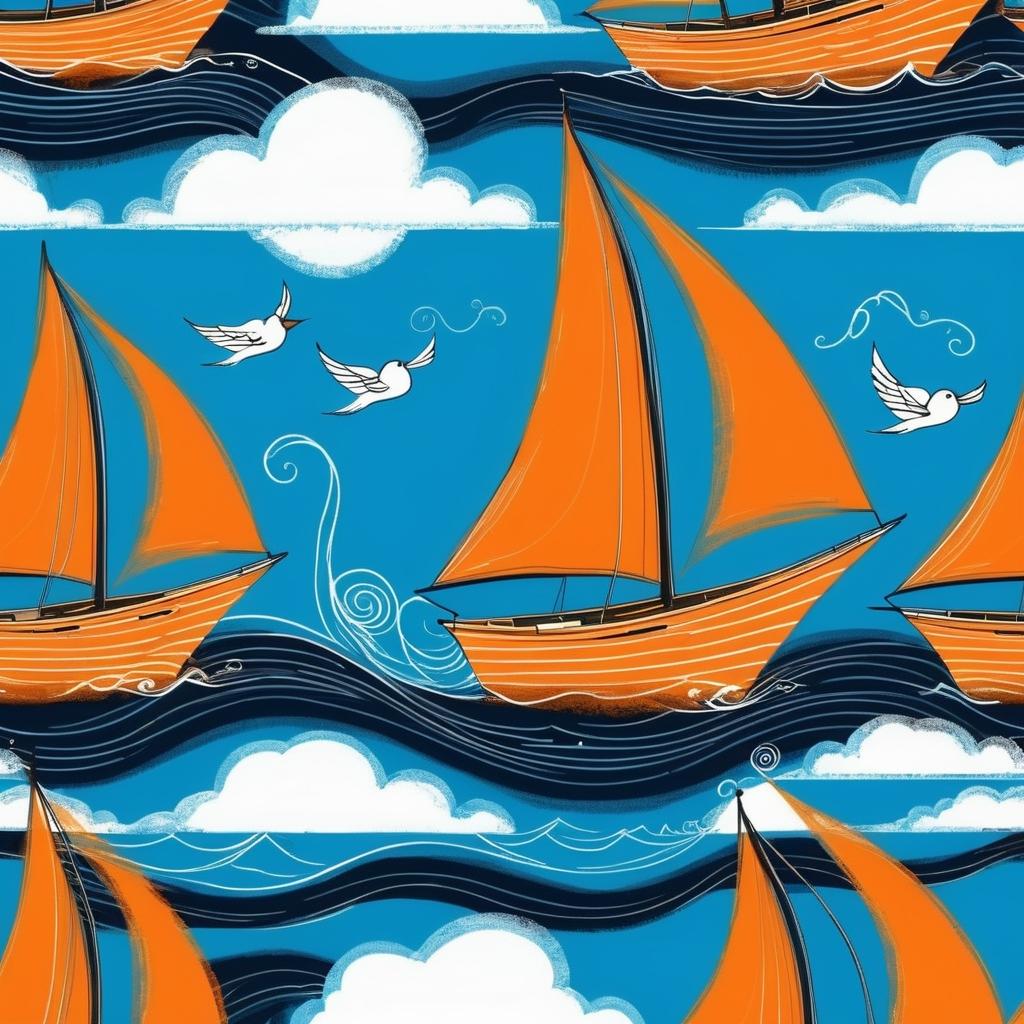 这幅作品以简洁的线条和轻快的色彩组合,描绘了一个充满幻想的航海场景。帆船在波浪中前行,天空中旋转的云朵和飞翔的鸟儿都为画面增添了动感和自由的气息。通过对简单元素的巧妙运用,创作者成功地传达了一种轻松、无拘无束的情感。