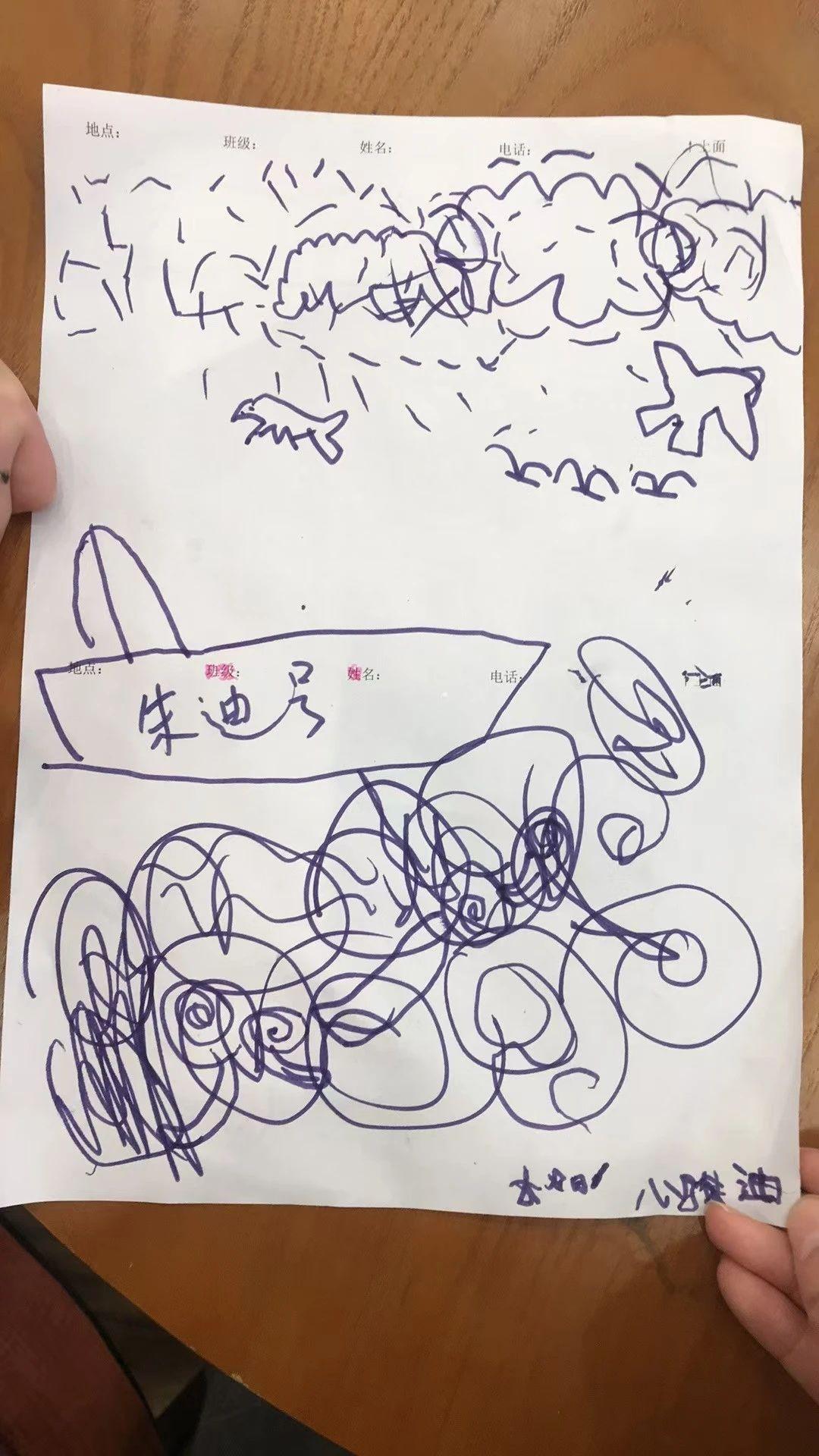这幅画充满了孩子般的天真和创造力。主要元素是简单的线条和形状,似乎描绘了一个天空和飞机。云朵和混乱的线条展示了孩子对自然和飞行的想象。整体构图随意而富有活力,传达了孩子对世界的好奇和探索精神。