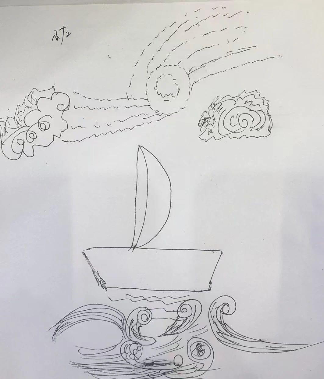 这幅画简单而富有童趣,主要元素包括一艘扬帆的小船、波涛起伏的海浪、太阳和云朵。线条轻松随意,构图中心是小船,给人一种航行的感觉。整体情感表达轻松愉悦,似乎传达了冒险与自然和谐的主题。