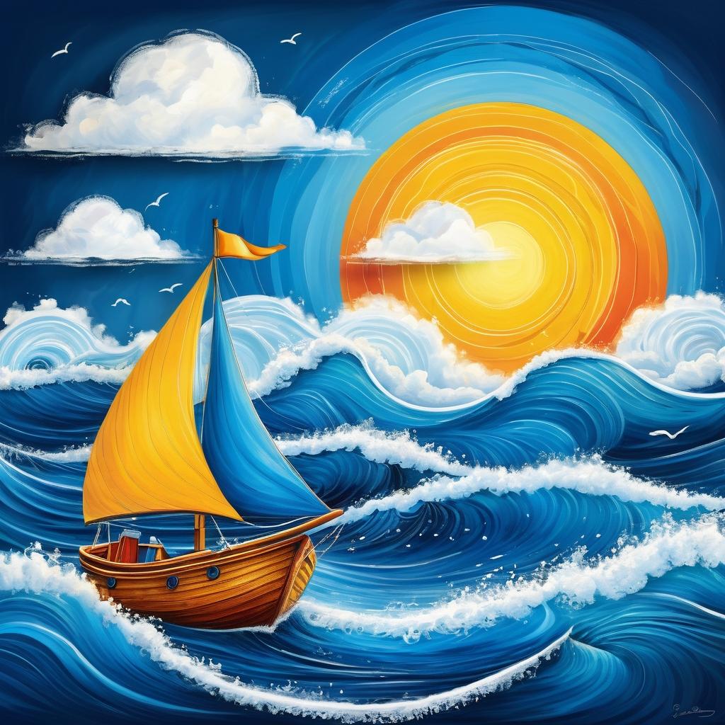 这幅作品通过简单的线条表现出一种纯真和自由的感觉。小船在波涛中的航行象征着探索和冒险,太阳和云朵的简单描绘增添了一种梦幻般的氛围。为了提升这幅作品,可以加入更多细节,如细腻的波浪纹理和丰富的天空色彩,使画面更具层次感。同时,可以尝试通过颜色的对比来增强视觉冲击力,如使用明亮的蓝色和黄色来突出海洋和天空的元素。这将使作品更加吸引眼球,并在观众心中留下深刻印象。