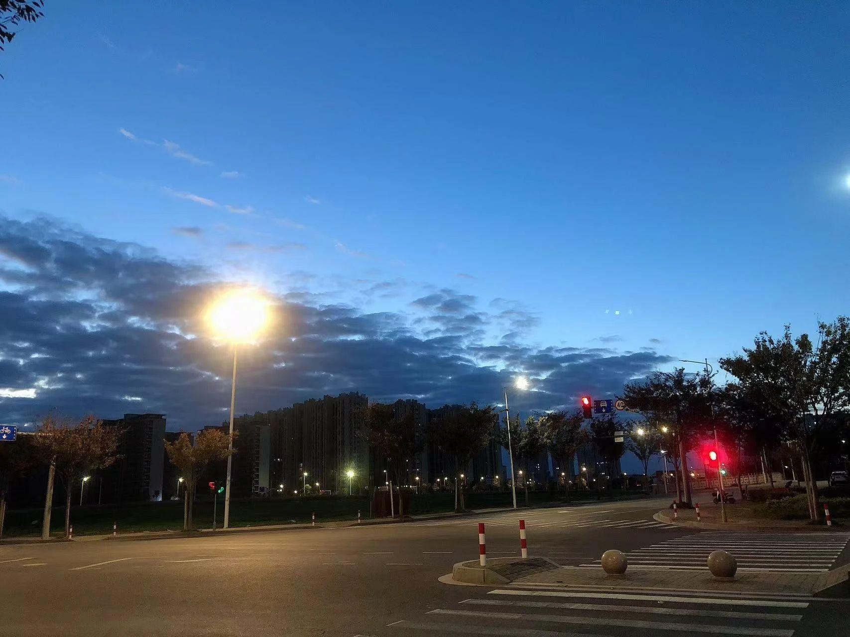 這幅作品展示了城市黃昏的景象,藍色的天空與雲層形成強烈對比,路燈和交通信號燈的光芒點綴其中,呈現出一種寧靜而略帶孤寂的氛圍。畫面構圖以道路為前景,遠處的建築物和樹木勾勒出城市的輪廓,描繪出一種現代都市的日常場景。