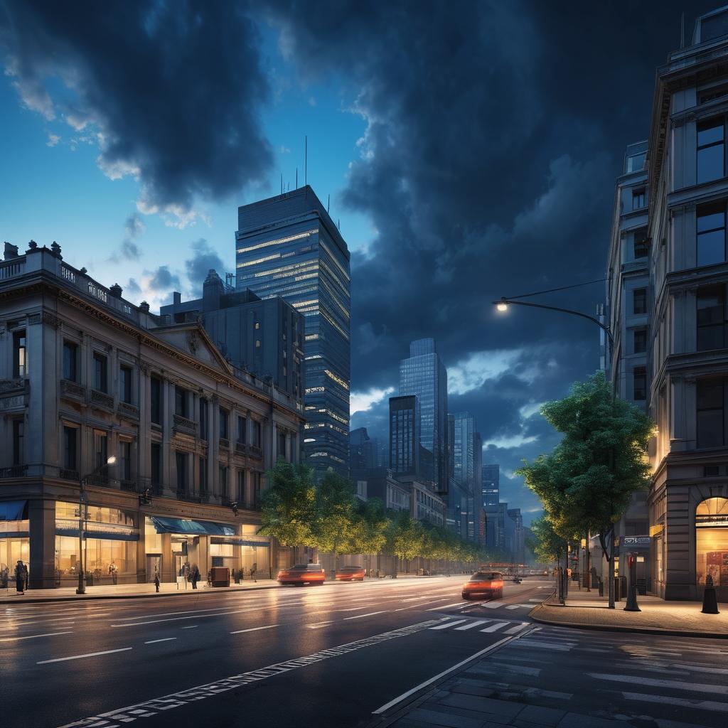這幅城市黃昏的作品以其微妙的光影變化和獨特的氛圍感吸引觀眾。畫面中,藍色天空與雲層之間的對比,讓人感受到一天即將結束的寧靜瞬間。路燈和交通信號燈的光芒不僅點綴了畫面,還強調了現代都市的日常特徵。這種日常生活中的詩意,讓人不禁聯想到Edward Hopper的風格,他常常捕捉城市中的孤寂與靜謐。在這幅作品中,創作者可以通過加強天空色彩的層次感來提高作品的表現力,並在細節處理上更加精緻,例如雲層的細節與建築物的陰影。加入動態元素如行人或車輛,將進一步豐富畫面的故事性,使其更具吸引力和情感共鳴。這種城市景觀的描繪,不僅是對現實的再現,更是一種情感的表達,讓觀眾在觀看時能夠感受到城市生活中的美與孤獨。