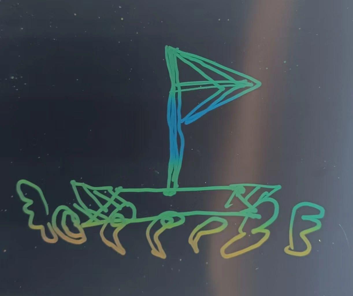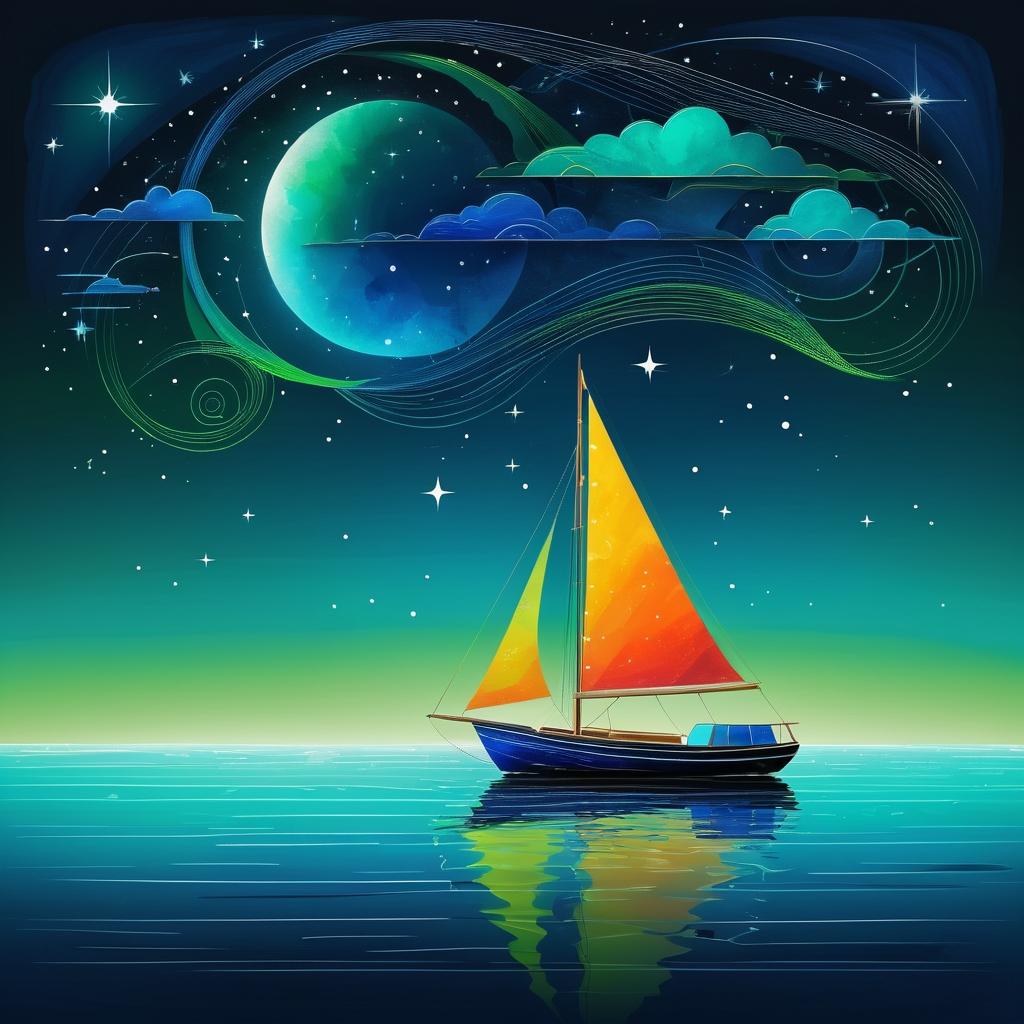 这幅作品采用简单的线条和色彩,描绘了一艘帆船。使用了绿色和蓝色的渐变色调,给人一种平和而自然的感觉。形状上,船体和帆的几何形状简洁而富有童趣,呈现出一种稚拙的美感。背景为深色,从而使船的轮廓更加突出。作品可能试图传达一种自由、探索或宁静的主题。
