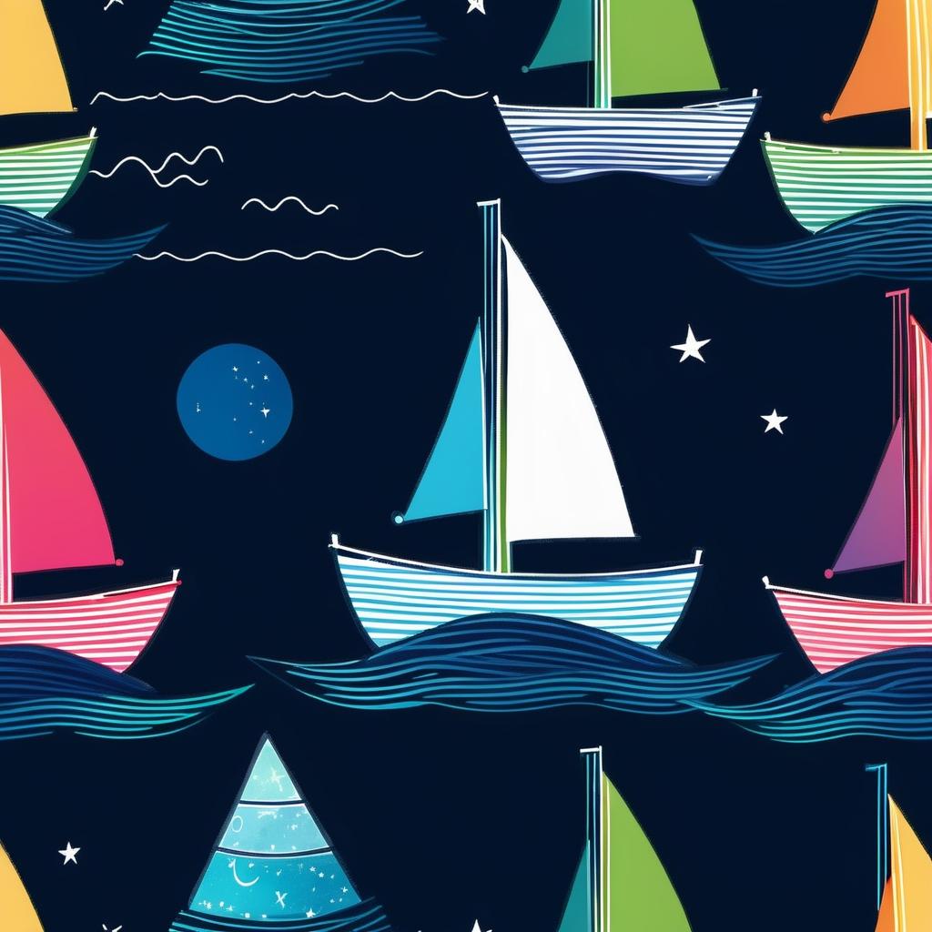 这幅充满童趣的帆船画作,通过其简单的线条和丰富的色彩,成功地捕捉了观众的注意力。画面中使用绿色和蓝色的渐变色调,营造出一种平和而自然的氛围,让人联想到海洋的广阔与宁静。在构图上,帆船的几何形状简洁而富有童趣,展现了一种稚拙的美感。深色背景的运用,使得帆船的轮廓更加鲜明突出,给人一种静谧的视觉体验。