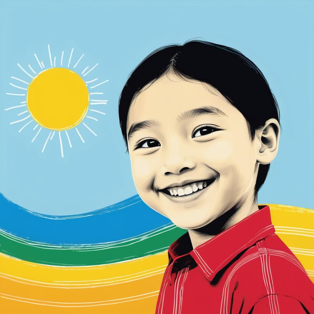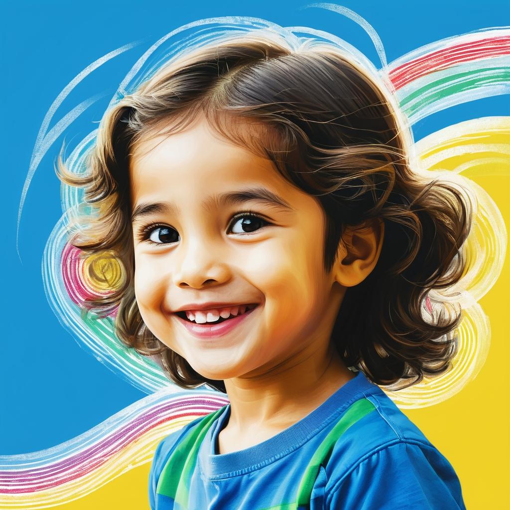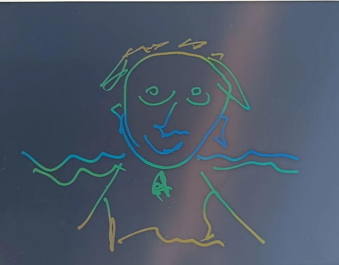 这幅作品通过简单的线条与色彩,展现了一种纯真与快乐的情感。人物形象以流畅的彩色线条勾勒,笑脸和波浪形的线条仿佛在传达一种轻松、愉快的氛围。颜色选择上,绿色、蓝色和黄色成为主要基调,营造出一种生动活泼的视觉体验。这种风格与保罗·克利的天真艺术有些相似,他的作品常常通过简单的图形和鲜艳的色彩,唤起纯真与梦幻的感觉。为了进一步提升这幅作品的艺术性,可以考虑加入更多背景元素,如阳光或花朵,以增强画面的故事性和视觉吸引力。此外,运用渐变色彩可以增加画面的层次感,使其更具深度。通过这些改进,这幅作品将在儿童艺术领域中更具辨识度和情感共鸣,激发观众的想象力并带来愉悦的视觉体验。