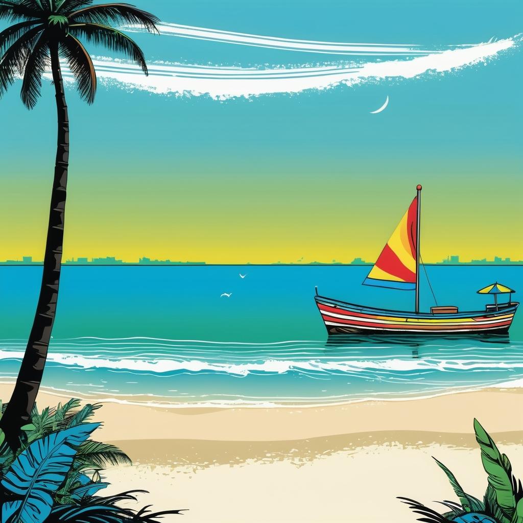 这幅儿童画呈现了一个海滩的场景,简单而富有表现力。左侧的棕榈树和右侧的小旗帜通过简洁的线条和鲜明的色彩描绘,传达出一种宁静和休闲的氛围。作品中以绿色和蓝色为主,给人以清新自然的感觉,这非常适合用作儿童艺术教育的素材。在这种创作中,孩子们可以通过简单的线条和色彩学习如何表达复杂的自然环境。进一步增加细节,例如加入贝壳和小螃蟹,或者在海面上画一艘小船,可以增强图画的趣味性和完整性。这种教育方式不仅能提高孩子们的绘画技巧,还能激发他们的想象力与创造力。通过模仿著名艺术家 Keith Haring 的风格,孩子们可以接触到天真艺术的独特魅力,学会用简单的元素创造出极具情感共鸣的作品。