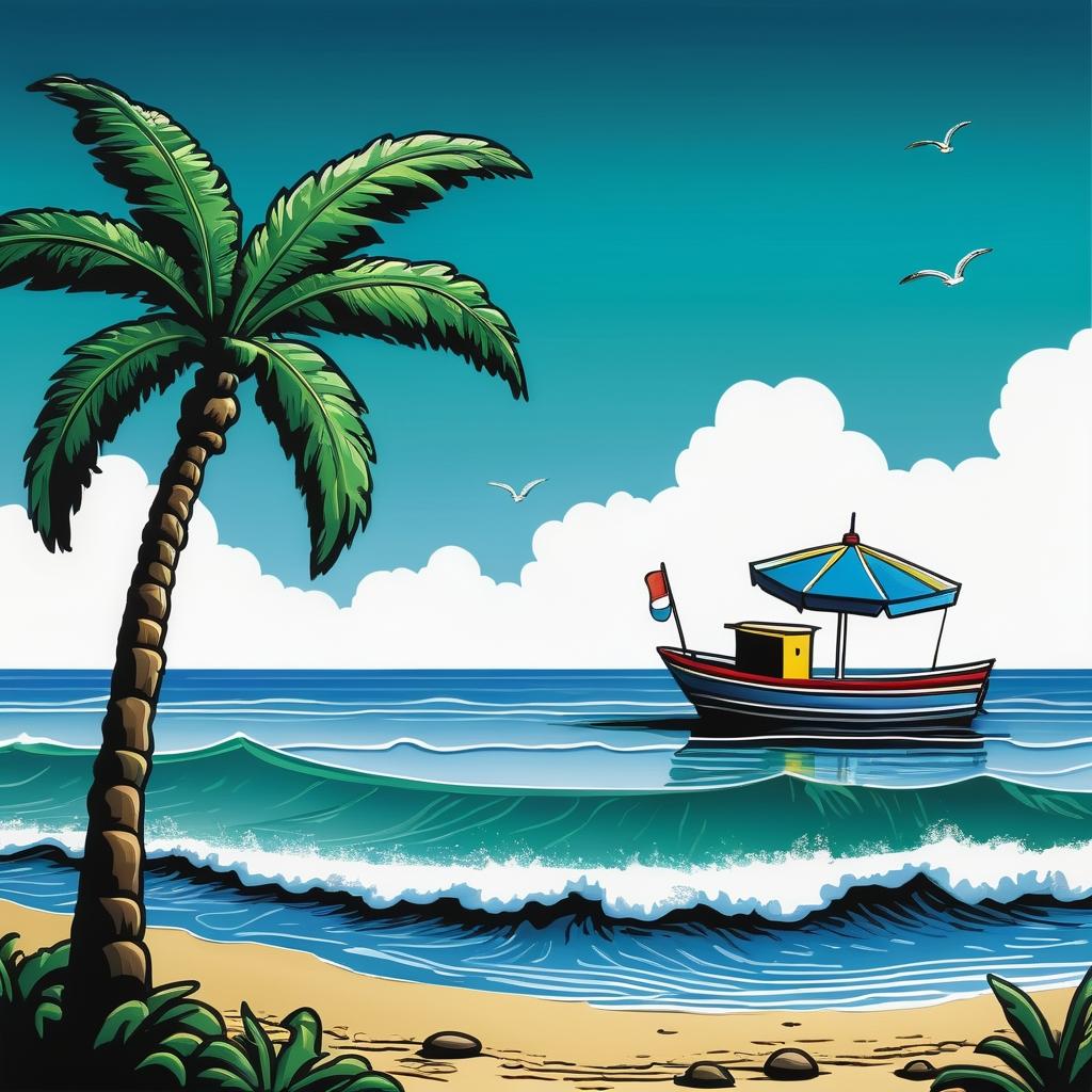这幅画以线条简单的图案呈现出海滩的情景。左侧是一棵棕榈树,右侧有一面小旗插在浅滩上。背景中有一些简单的波浪和天空中的云朵。整体色彩以绿色和蓝色为主,给人一种宁静和休闲的感觉。