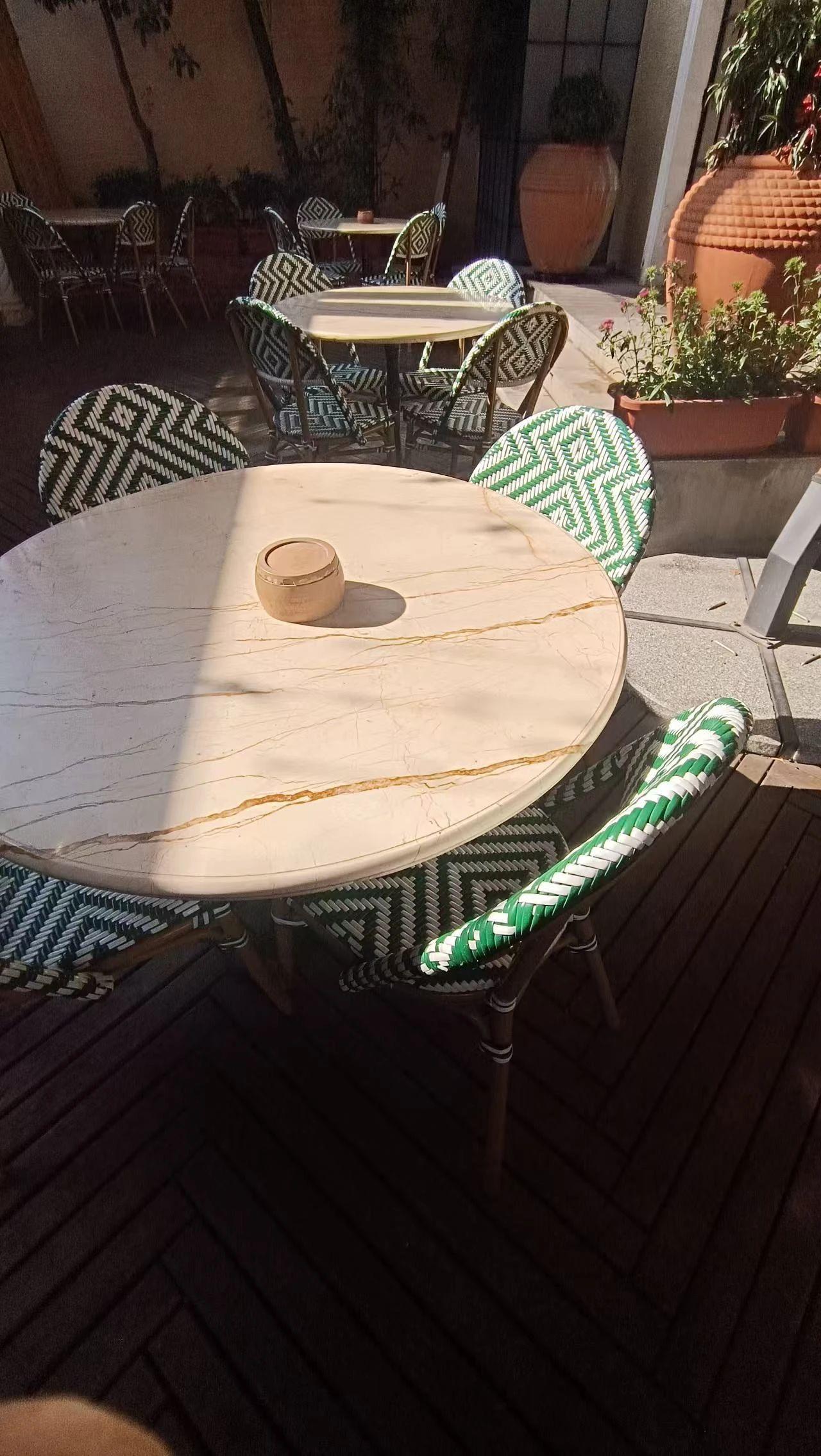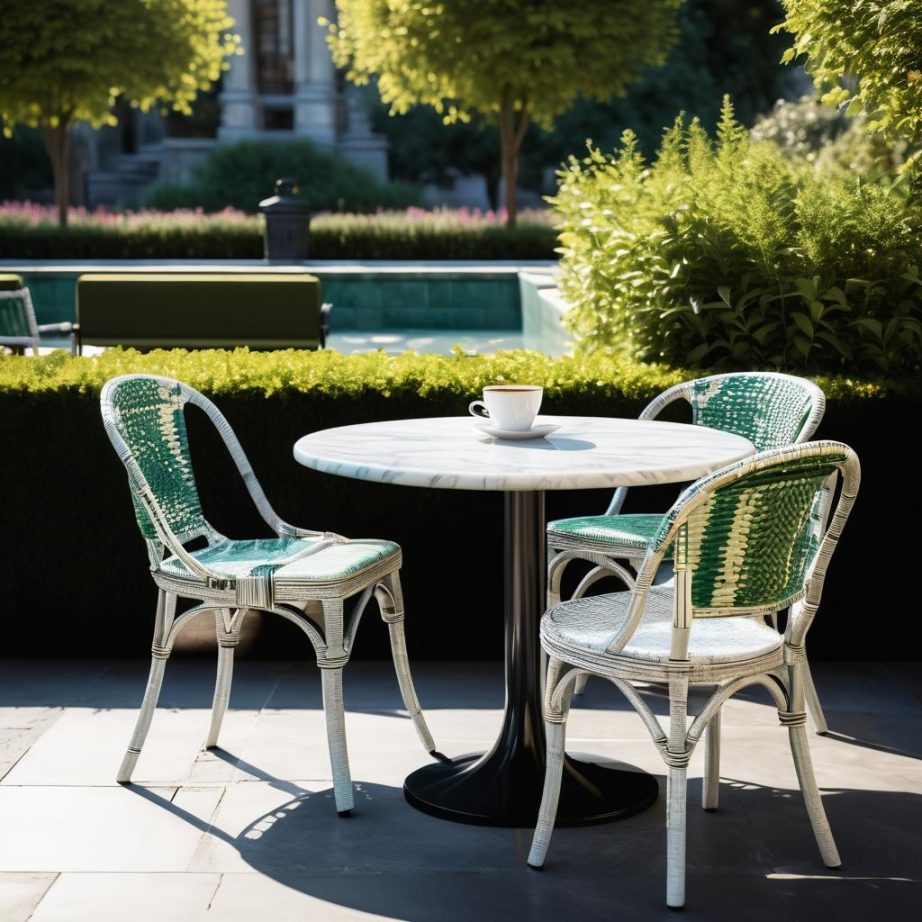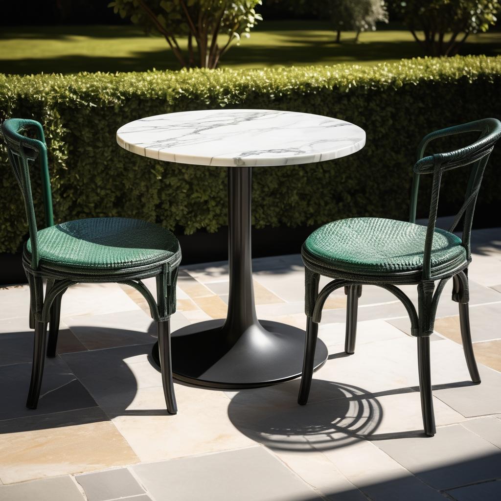 这幅作品展示了一个户外咖啡馆的阳光角落,阳光照射在圆形大理石桌上,周围是绿白相间的藤制椅子。整体色调温暖,光影效果自然,给人一种宁静惬意的氛围。创作者可能想要传达一种闲适的生活方式和舒适的户外环境。