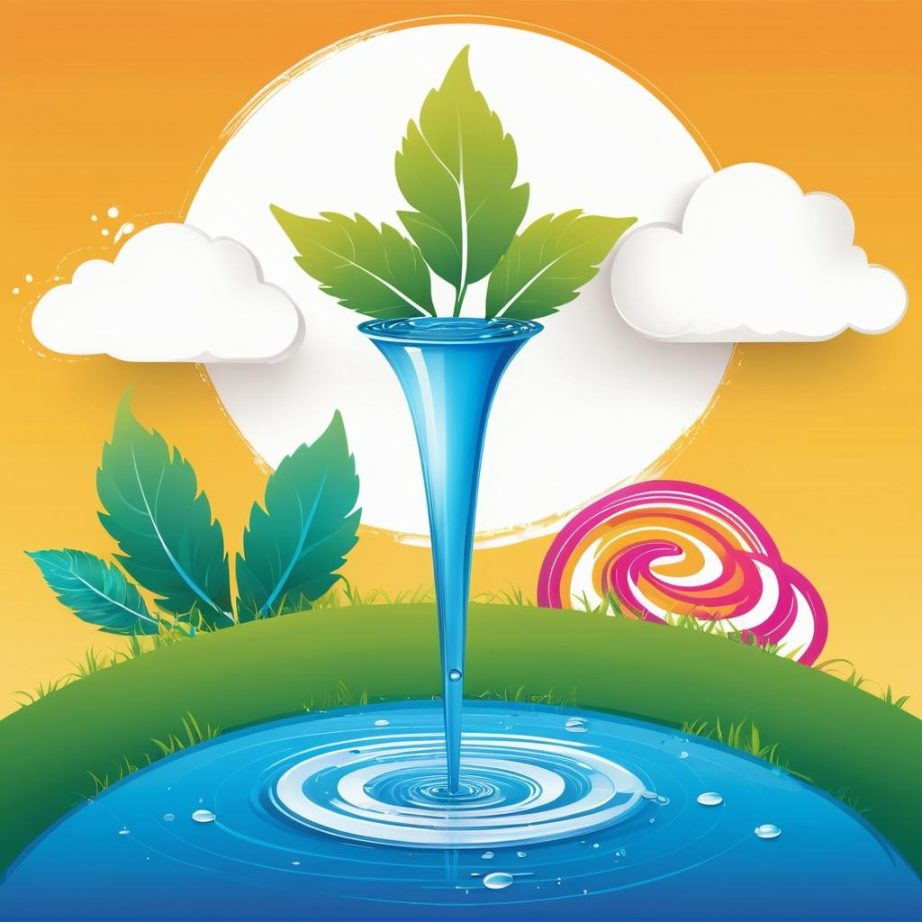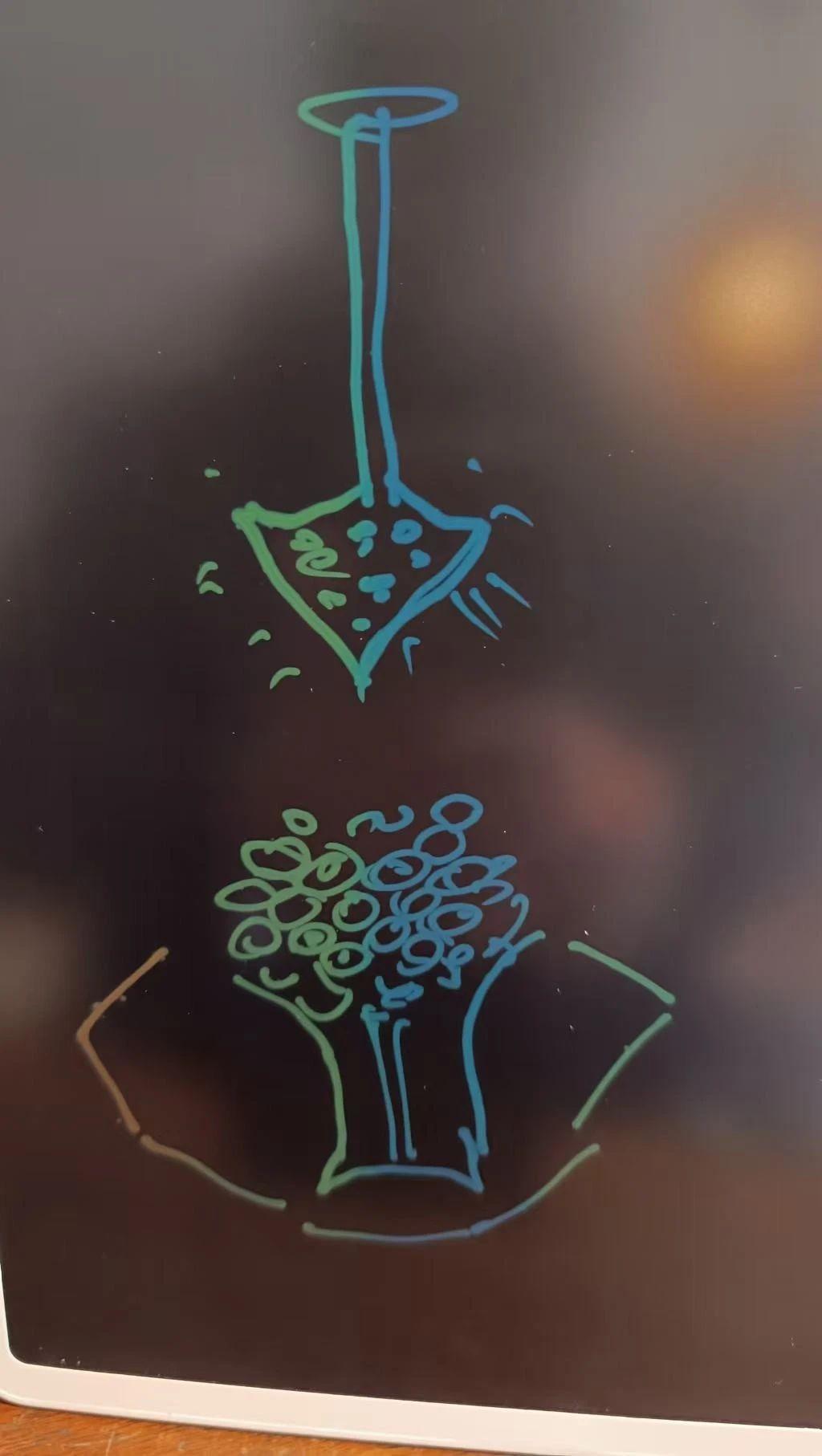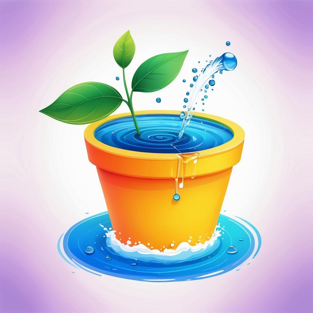 这幅画使用了简单的线条和色块描绘了一个漏斗状的物体,可能象征着浇水,下面是一个由圆形构成的植物。画面采用了明亮的色彩对比,表达了一种轻松和自然的氛围。创作者可能想传达自然界中的生长和循环这一主题。
