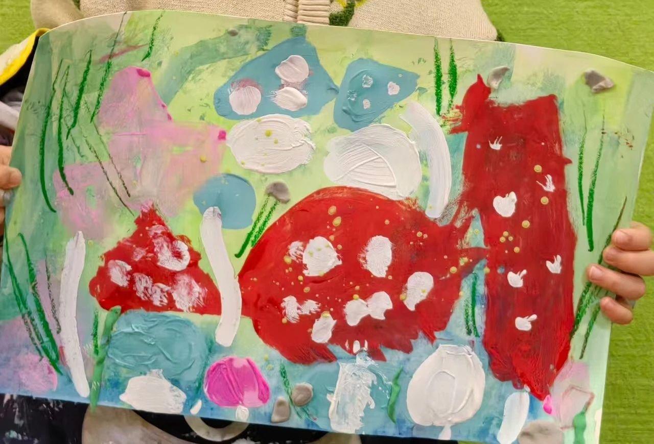 这幅画作展现了孩子们在艺术创作中的天真与纯粹,使用大胆的色彩和自由的线条,表现出一种自然的生动景象。要提升这幅作品,可以在背景中加入更多层次的色彩过渡,使画面更具深度。同时,进一步定义形状以增加抽象元素的辨识度。引导小艺术家在创作过程中思考色彩的运用和形状的组合,创造出更具故事性的作品,并添加一些细节以增强观者的互动体验。