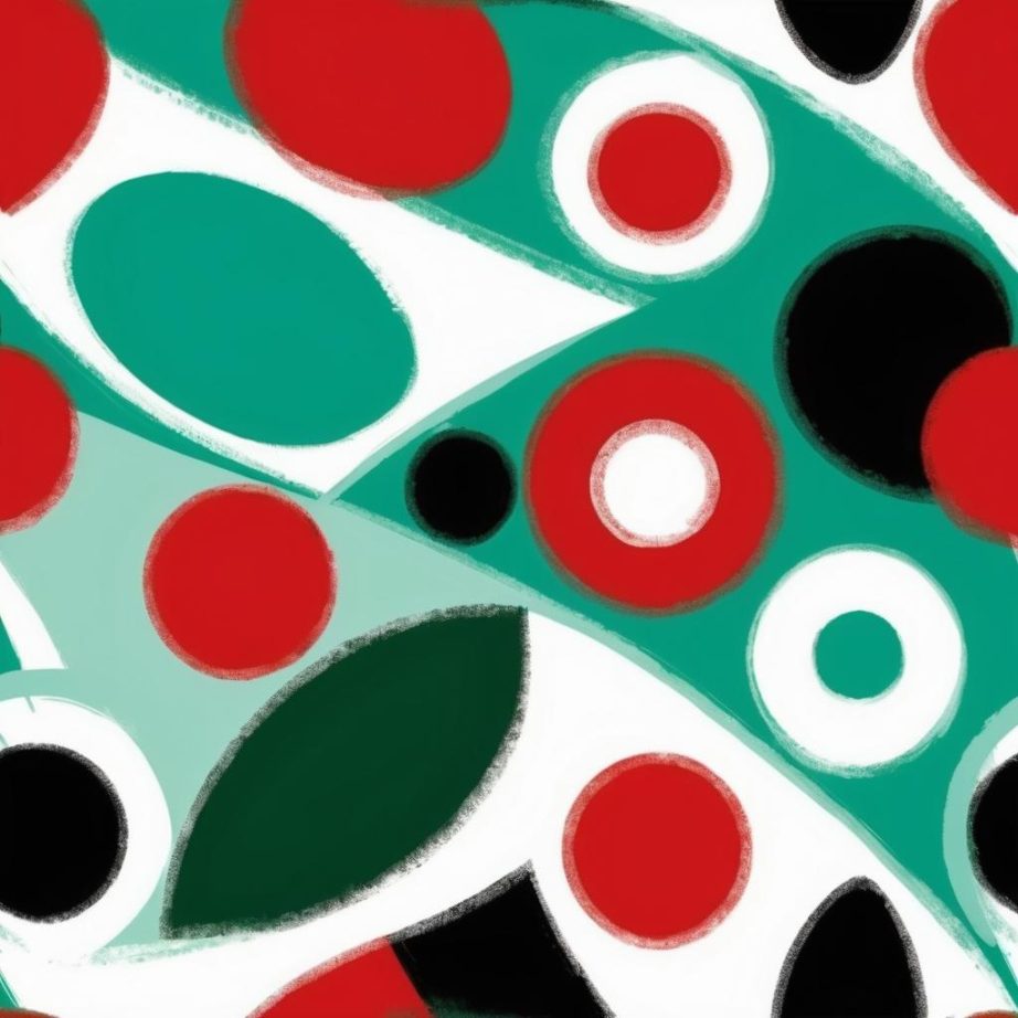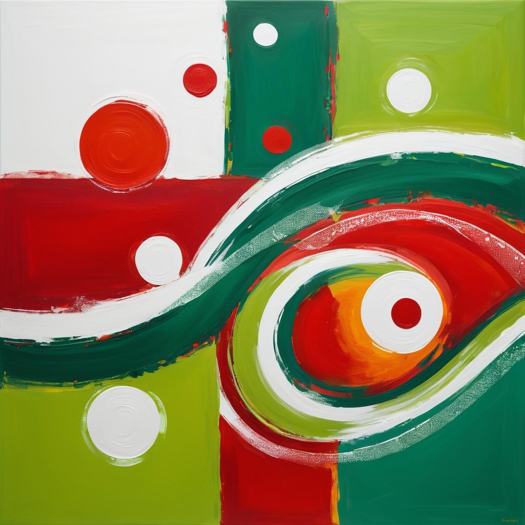 这幅作品充满了鲜艳的色彩和抽象的形状,主要以红色、绿色和白色为主。画面的构图随意而富有童趣,似乎表现了一种自然的抽象景观。白色的圆点和绿色的线条增添了画面的活力,可能传达了一种欢快和无忧无虑的情感。
