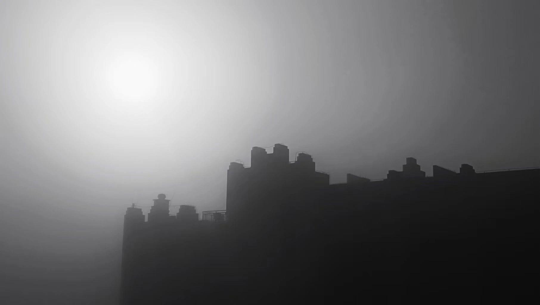 这幅图像呈现了一座城市建筑在浓雾中的剪影。画面中的灰色调和柔和的光影效果营造出一种神秘且宁静的氛围。太阳的微弱光芒试图穿透厚重的雾气,给人一种压抑却又希望的感觉。建筑物的顶部轮廓模糊不清,与背景的雾气融为一体,进一步加强了画面的抽象感。