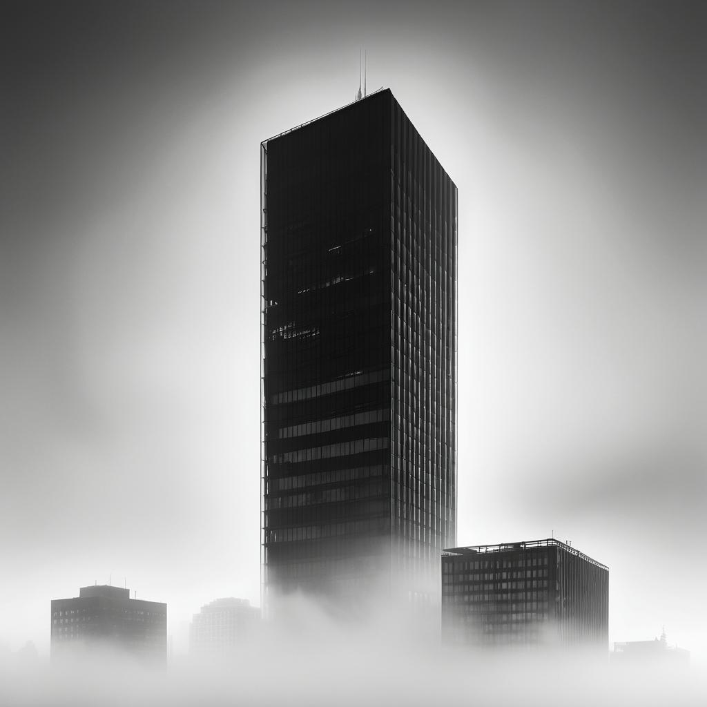 这幅作品通过简约的黑白色调和浓雾的使用,成功地传达了一种城市的孤寂与宁静。为了增强作品的情感深度,可以考虑增加一些细节,例如在雾中若隐若现的人影或车辆,来表现城市的生机与活力。还可以利用对比更强的光影效果来突出建筑的几何线条,从而增加画面的层次感。通过这些调整,作品可以更好地表现出城市在宁静与繁忙之间的微妙平衡。