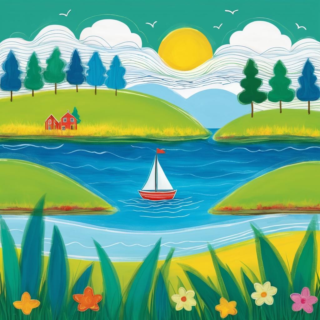为了提升这幅作品,我们可以考虑融入更多的细节和故事元素。例如,云朵中可以使用渐变色来增加深度,草地则可以通过层次的变化来表现出不同的质感和生命力。在船的周围加入水面的波纹,能让整个画面更具动感和活力。此外,鼓励孩子添加个人元素,比如他们想象中的冒险故事或最爱的景物,能让作品更具个性化和情感共鸣。