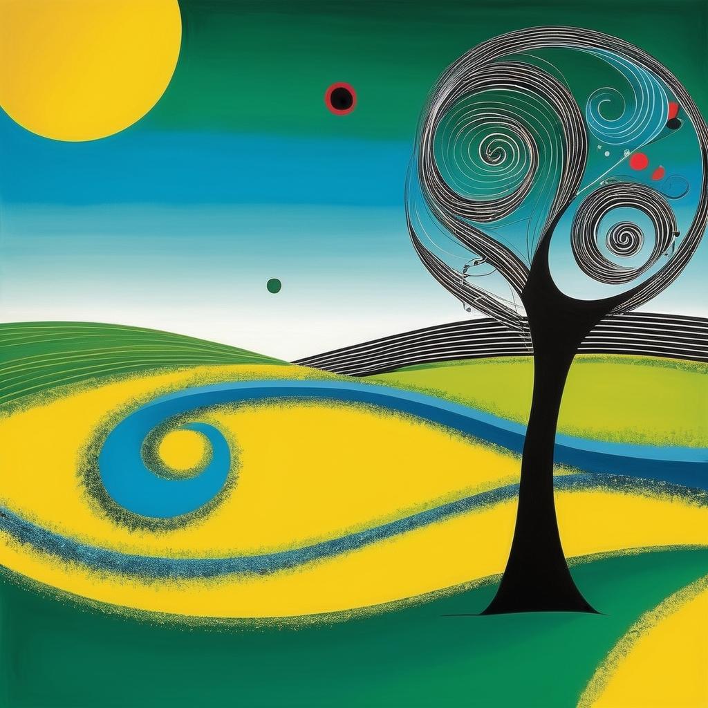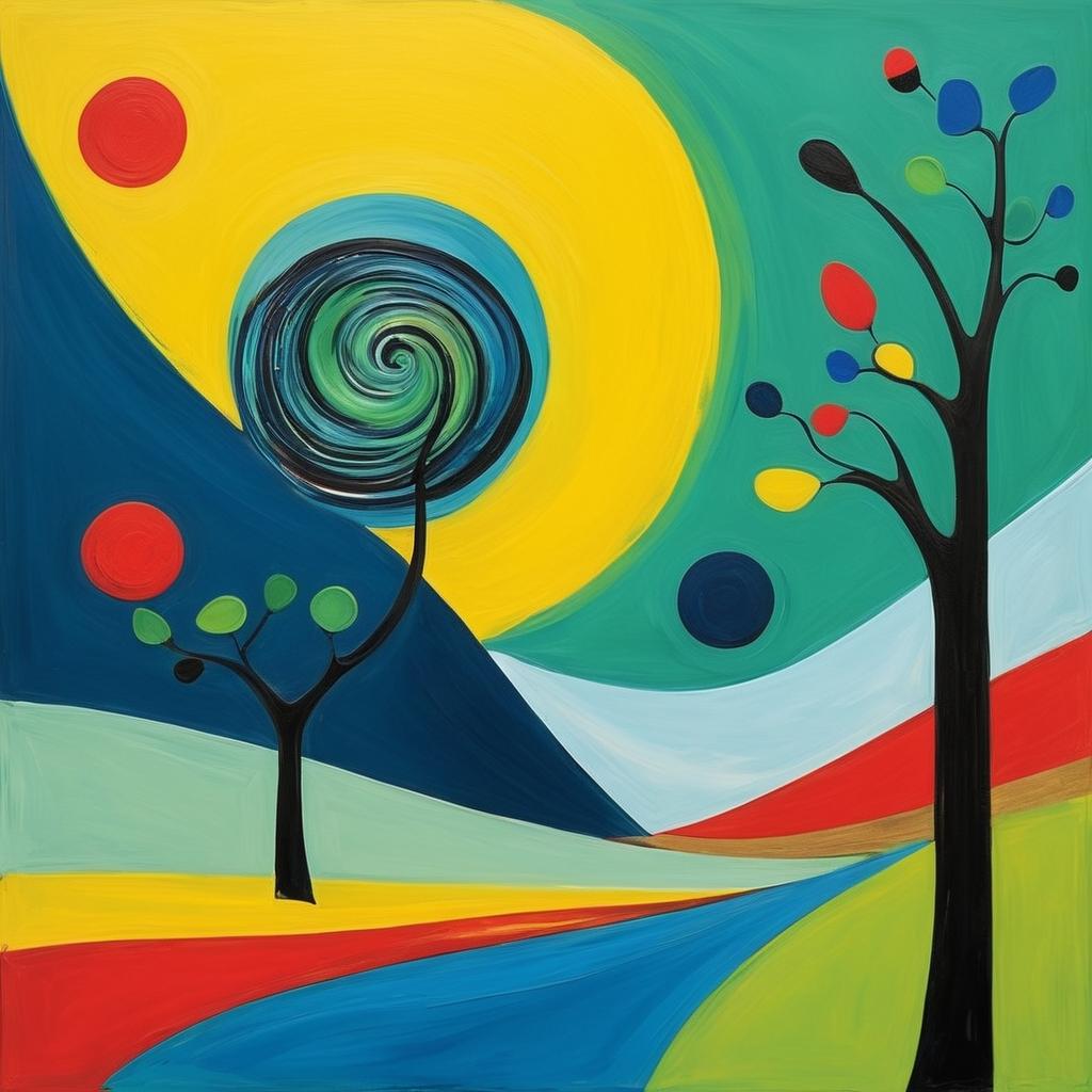 这幅作品的风格让人联想到超现实主义艺术家,如Joan Miró,他的作品同样追求色彩和形状的自由组合,以唤起观者的想象和思考。这样的创作方式不仅可以培养孩子的艺术兴趣,还能激发他们的思维能力,帮助他们在日常生活中更好地观察和理解世界。