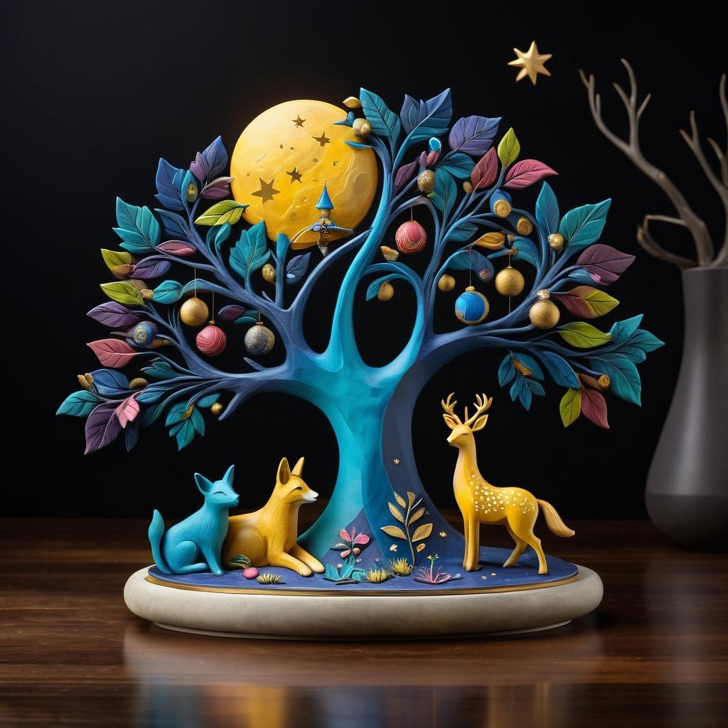 这幅由黏土制成的作品以其鲜艳的色彩和丰富的细节吸引了观者的注意。形状像圣诞树的结构上布满了各种可爱的动物,每一个小动物都栩栩如生,散发出无限的童趣。这种设计让人联想到自然界的多样性和生命的活力。背景的深色使得前景的动物更加突出,而右上角的金色圆形则为作品增添了一丝神秘感,可能象征着月亮或太阳。通过加入更多背景细节,例如星空或森林,可以加强作品的神奇氛围。此外,利用光影效果突出某些动物的独特之处,不仅可以增加视觉层次,还能让观者更深入地体验到这幅作品所传达的欢乐与美好。这种富有创造力的表现方式不仅适合儿童,也能让成年人重新唤起童年的回忆,感受到自然的神奇与生命的美丽。