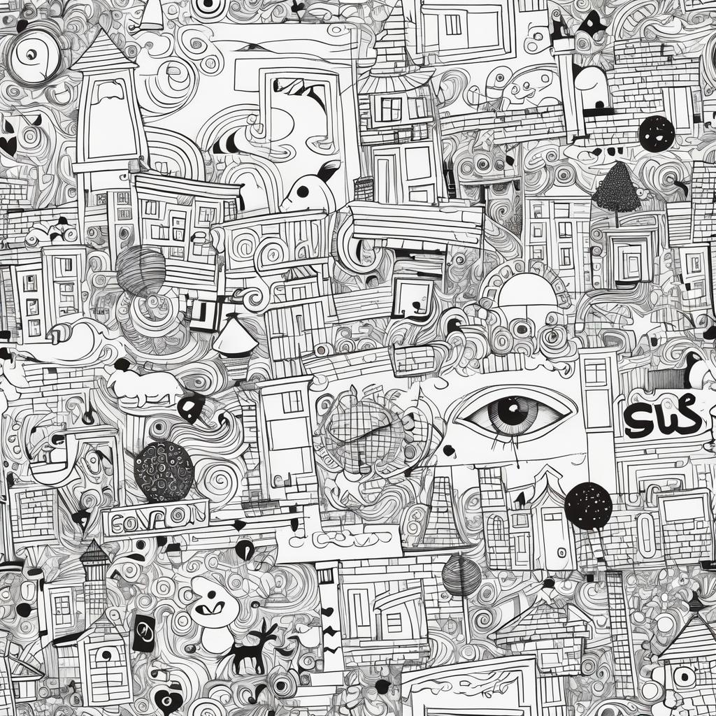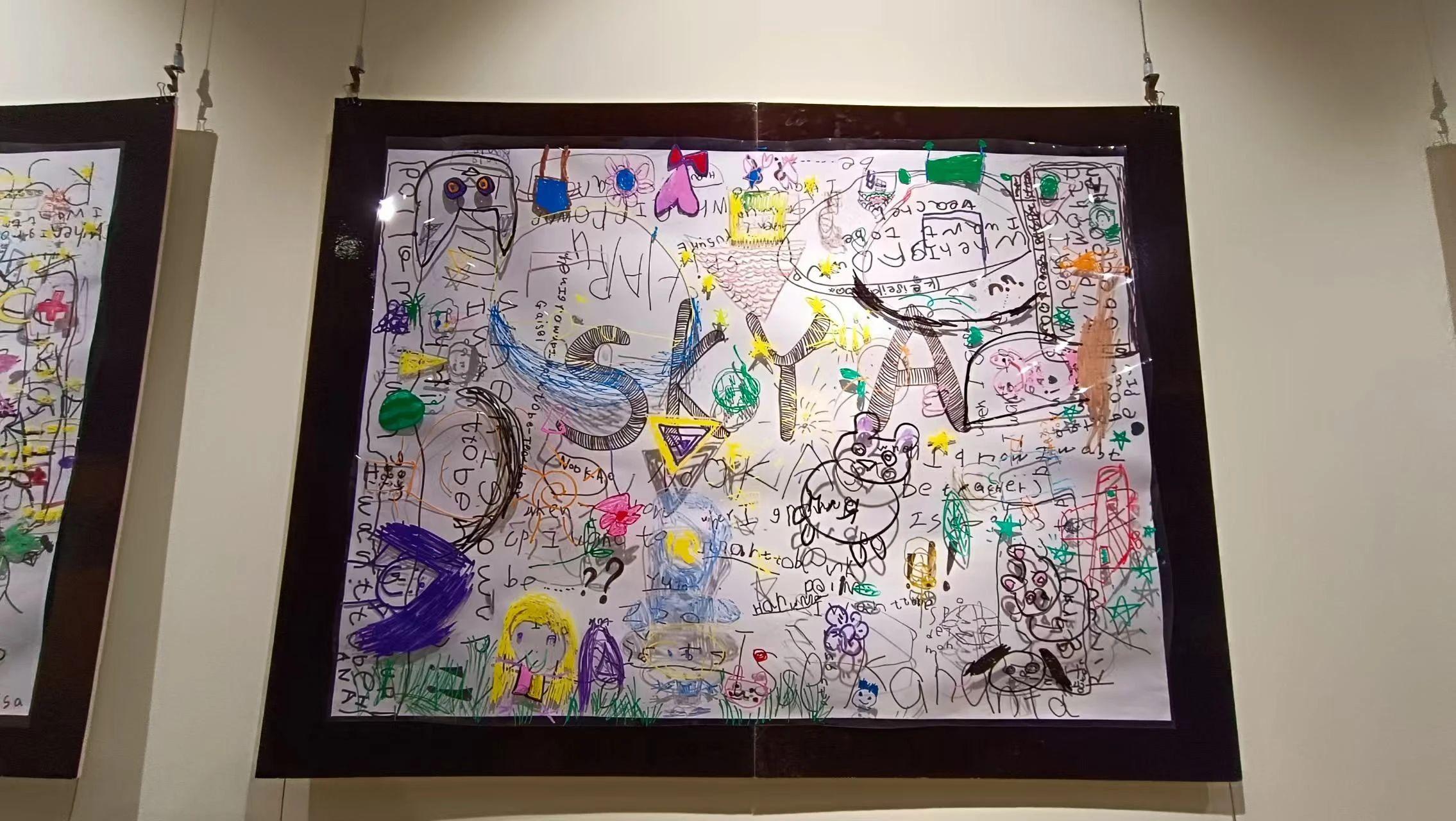 这幅作品充满了孩子般的涂鸦风格,色彩丰富多样。画面中有许多随机的图案和符号,包括动物、人物、文字和抽象形状。整体构图显得随意且富有创意,表达了一种自由和无拘无束的情感。这种作品可能传递出儿童对世界的好奇心和想象力。