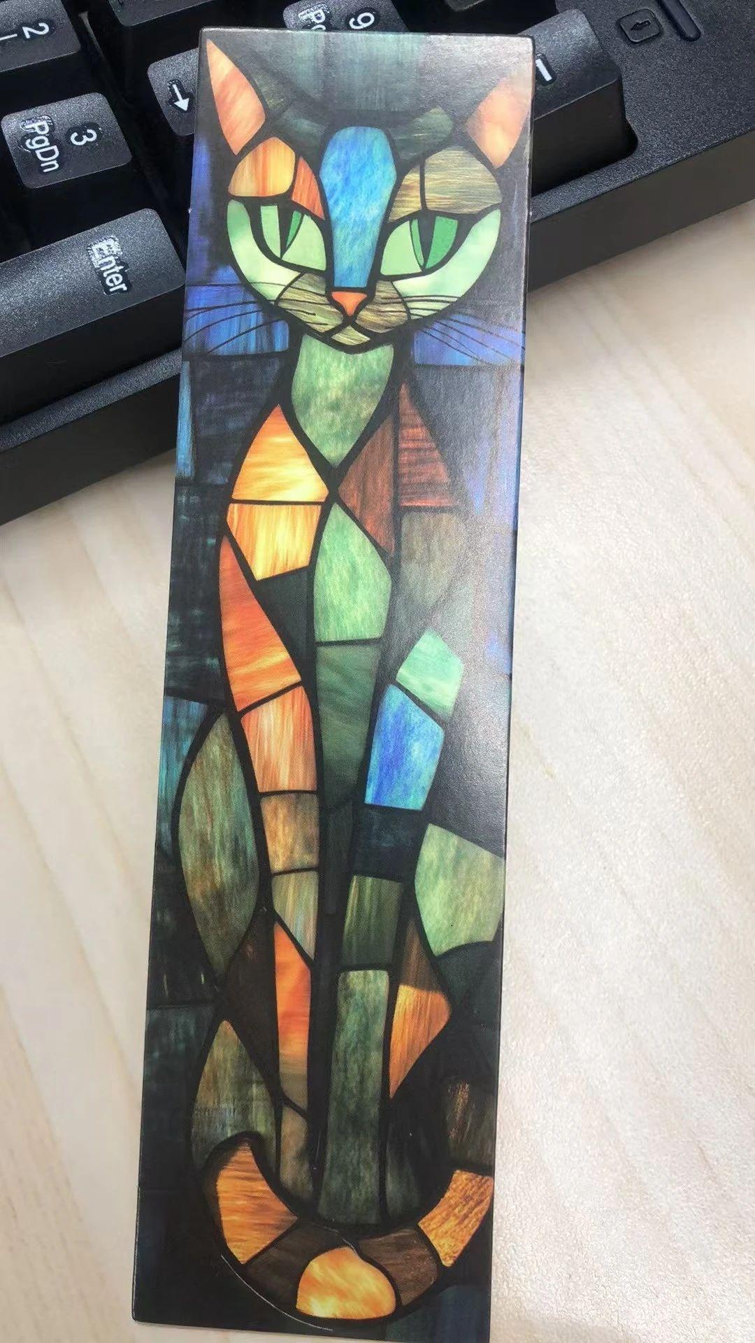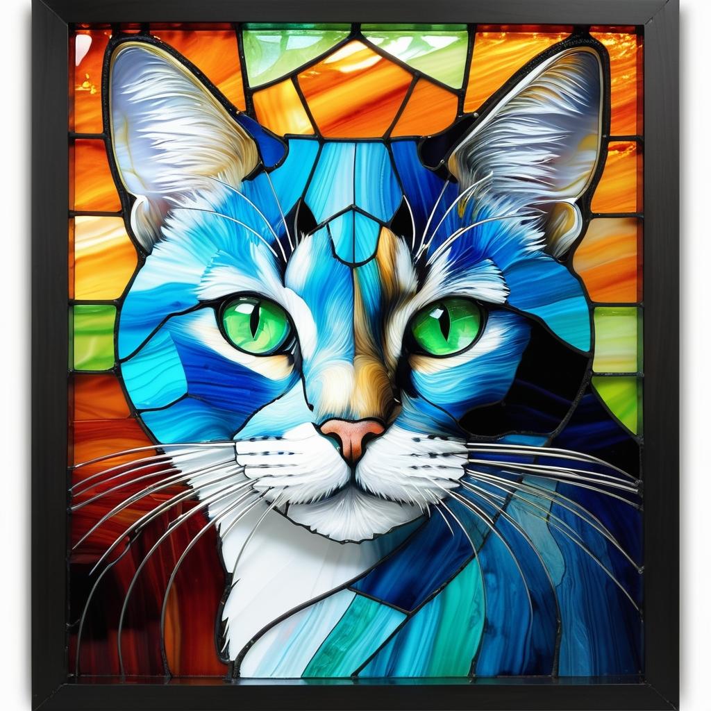 这幅作品描绘了一只猫,采用了马赛克风格的玻璃拼图形式。作品色彩丰富,以蓝色、绿色和橙色为主,形成强烈的视觉对比。猫的形象被几何形状分割,整体构图呈现出一种抽象艺术的感觉。创作者可能意图表达一种静谧和神秘的氛围,猫的绿色眼睛增加了作品的神秘感。