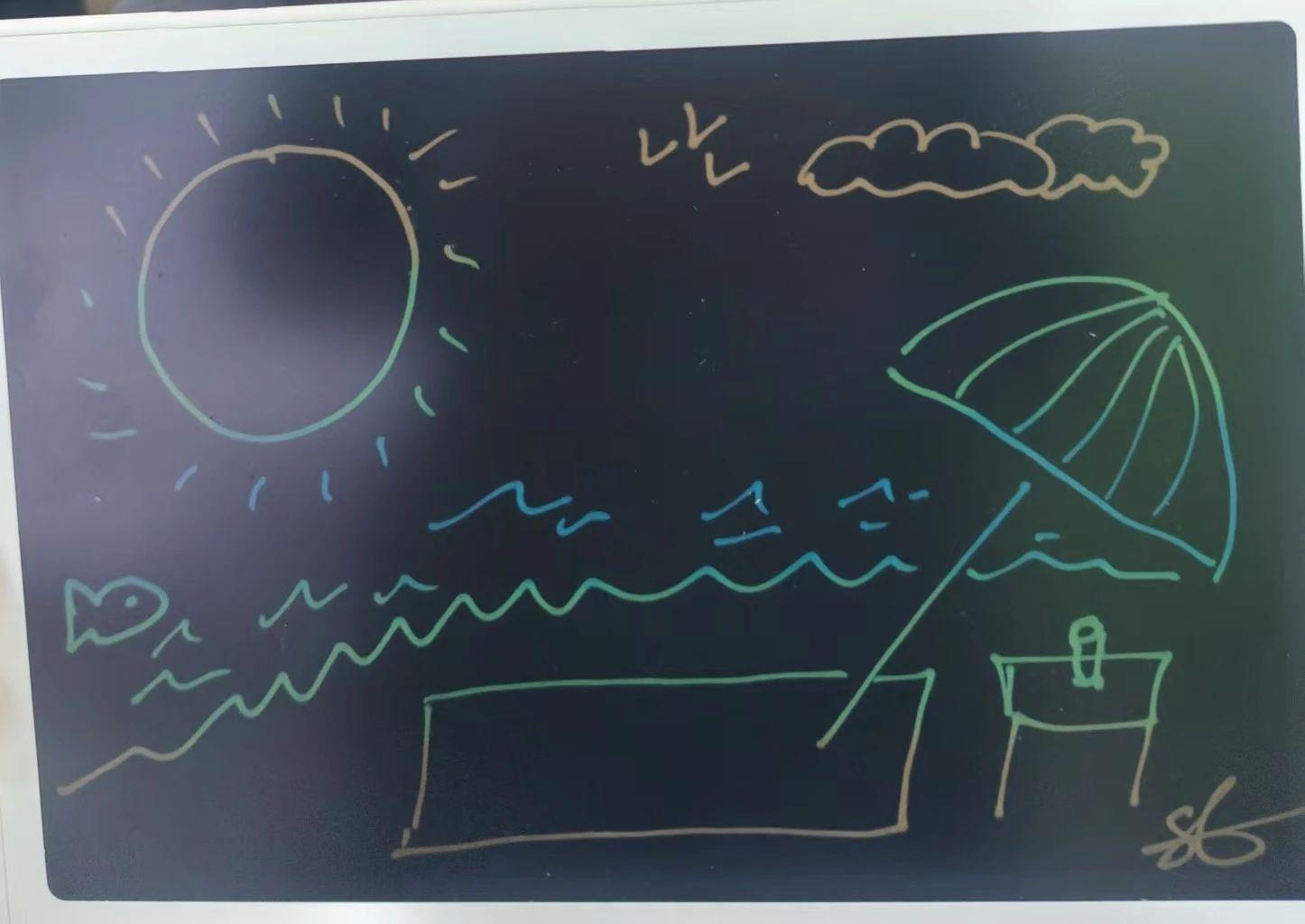这幅作品通过简单的线条和色彩勾勒出一个典型的沙滩场景,充满了童趣和想象力。为了提升作品,可以加入更多细节,例如在海浪中添加一些海洋生物,或者在天空中增加飞翔的鸟群,以丰富画面的动态感。此外,尝试运用渐变色来表现天空和海面的颜色变化,能使作品更加生动。通过这些细节的强化,作品将更具观赏性,并能激发观众更多的想象空间。