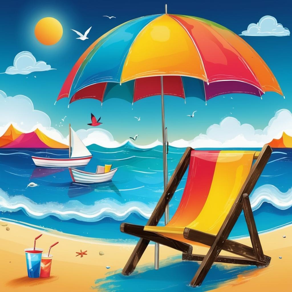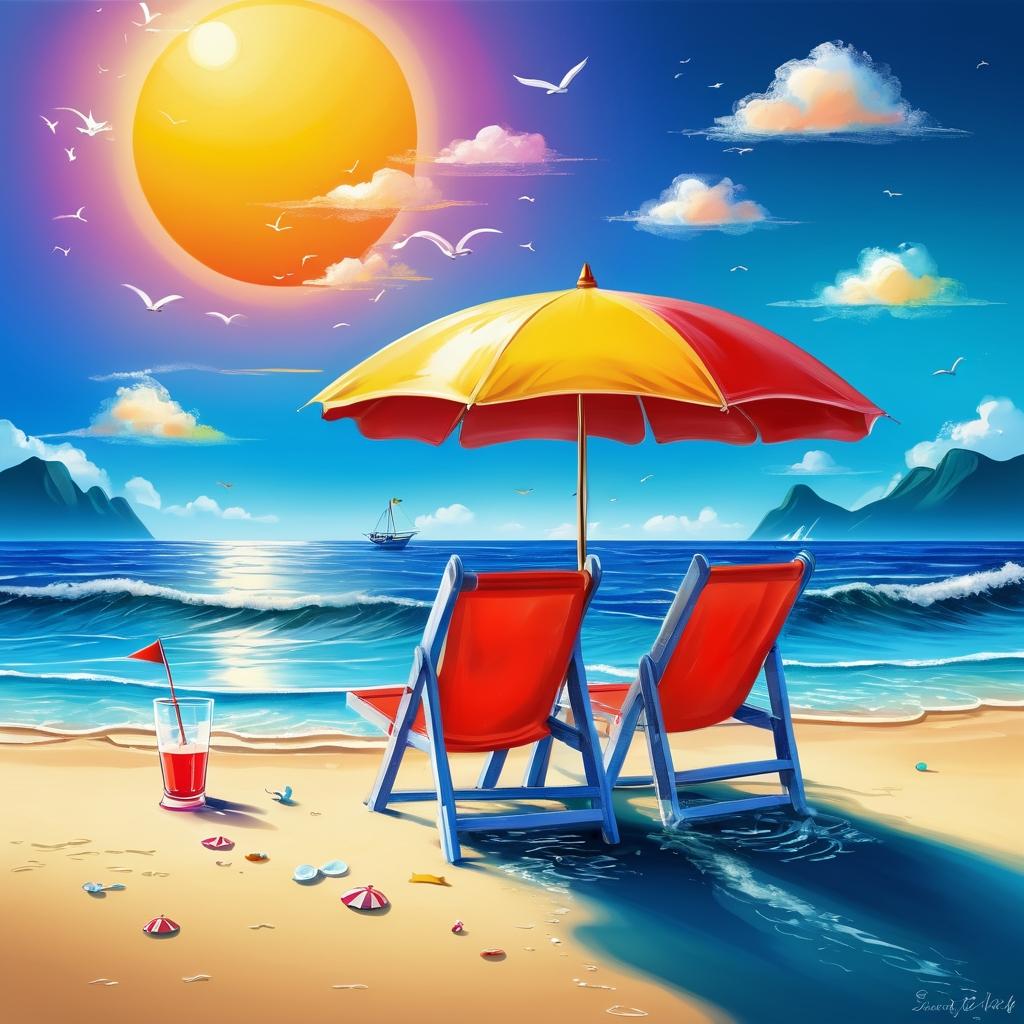 这幅作品采用了简洁的线条和明亮的色彩,描绘了一个海滩场景。主要元素包括太阳、海浪、沙滩椅、遮阳伞和一张小桌子。整体构图简单而富有童趣,给人一种轻松愉悦的感觉。创作者可能想要传达一种度假、放松的主题。