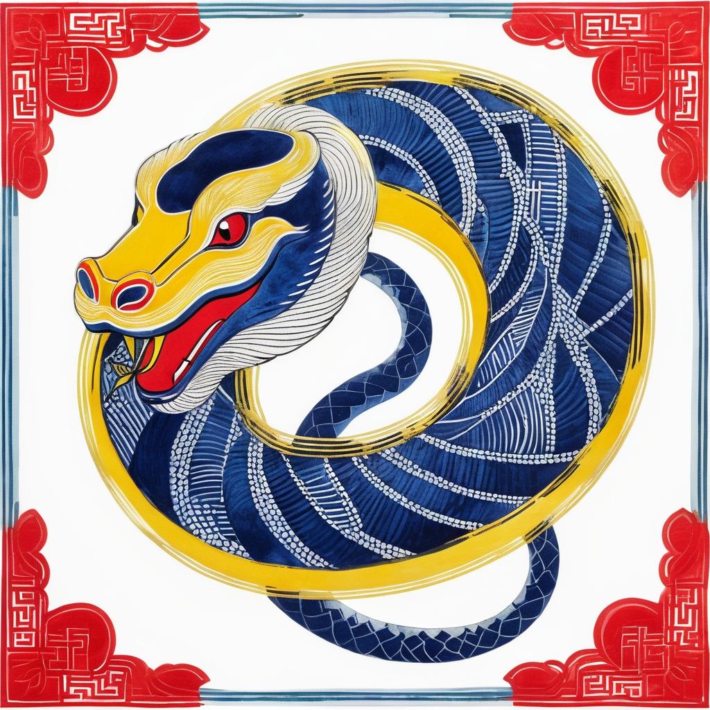 结合传统蛇年主题与现代设计元素,可以在创作中考虑融入几何构图,如使用圆形、螺旋等象征再生与循环的图案,以此象征蛇的灵动与生命力。同时,添加跨文化符号,如希腊神话中的智慧女神雅典娜的象征,进一步丰富画作的文化内涵。色彩上采用对比鲜明的冷暖色调,增强视觉冲击力。通过现代化的设计手法,使作品不仅承载传统文化,还能够与全球观众产生共鸣。