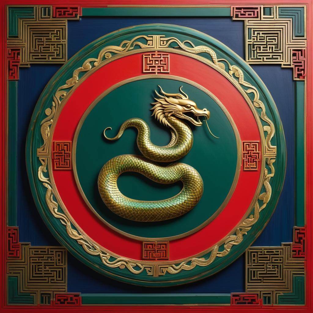 基于图片与文化背景,此作品可融入现代几何构图或其他跨文化象征,例如引入地球、星空等符号,增强国际化元素。可在配色上采用红金与蓝绿的对比,既保留传统的吉祥寓意,又增添现代艺术的视觉冲击力。通过细腻的雕版工艺展现出蛇的灵动与神秘,结合多层次的色彩渐变,使其更富有立体感与层次感。在设计中,可引入现代设计手法,如对称构图、渐变色块等,打造出兼具传统魅力与国际视野的作品。