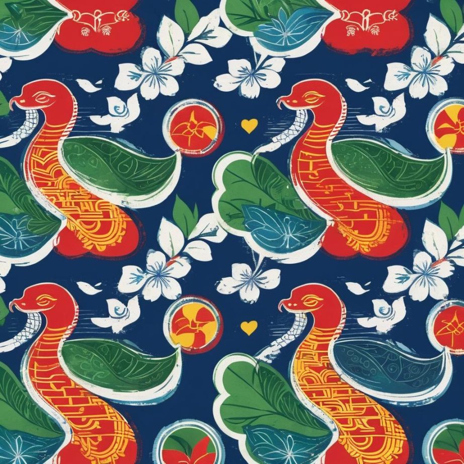 Q版年画以卡通化的蛇形象为主轴,结合传统吉祥元素(如祥云、灯笼和牡丹),通过柔和的线条和饱和的配色,呈现出既传统又俏皮的风格。画面融入国际化符号(如和平象征的橄榄枝、地球元素等),使作品兼具文化传承与全球共融的寓意。