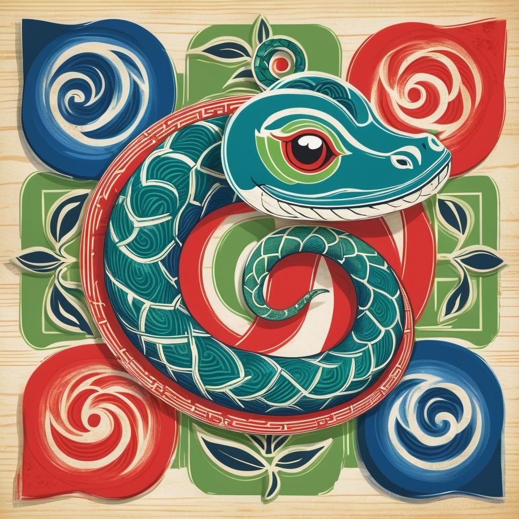 以西方版畫大师做为参考风格创作与原作有关联且适合儿童和国际观众的Q版风格。使用卡通化的蛇形象,通过夸张的表情、活泼的动作和柔和的色彩搭配,使画面充满趣味性,搭配现代几何构图,增强画面的层次感和观赏性,传递共融和祝福的寓意。在设计中,融入现代化的审美元素,如对比鲜明的色块、流畅的线条和简洁的构图,以吸引国际观众的关注。通过这种方式,传统的中国文化能够以一种轻松且现代的方式被广泛传播。