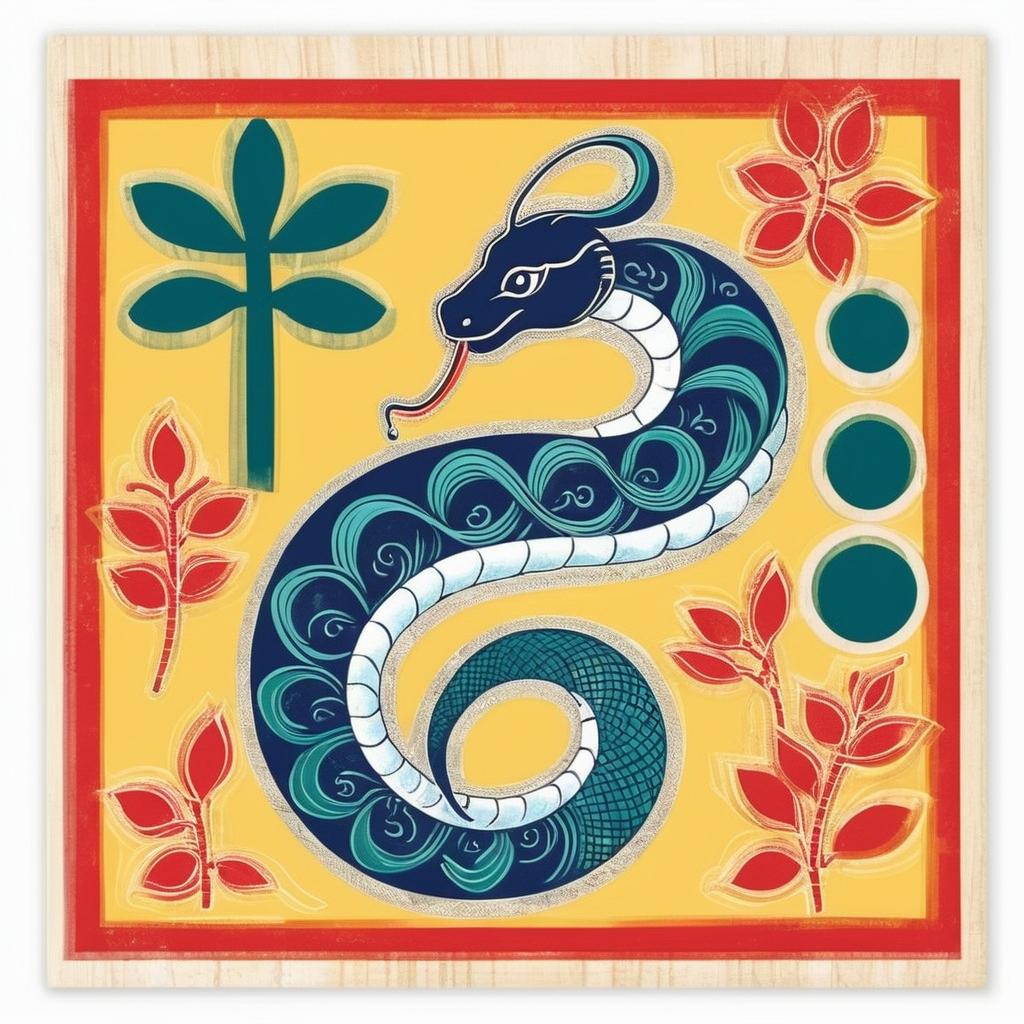 以西方版畫大师如亨利·马蒂斯作为参考,通过其大胆的色彩运用和简洁的线条,创作适合儿童和国际观众的Q版风格。使用卡通化的蛇形象,通过夸张的表情、活泼的动作和柔和的色彩搭配,使画面充满趣味性,搭配现代几何构图,增强画面的层次感和观赏性,传递共融和祝福的寓意。参考马蒂斯的风格,加入现代元素如和平象征的橄榄枝、地球元素等,形成一种独特的视觉语言。