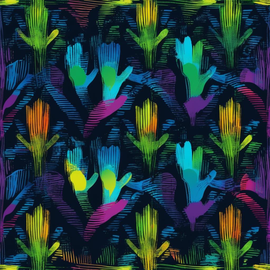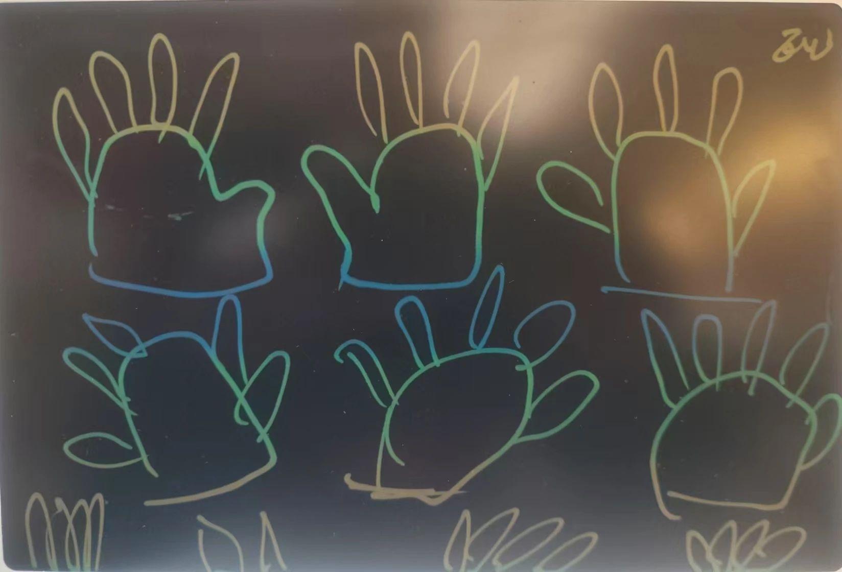 这幅作品展示了多个彩色手掌轮廓,用不同的颜色线条在深色背景上绘制。手掌形状简单而富有童趣,线条的颜色从绿色到蓝色变化,整体构图呈现出一种随意和自由的感觉。创作者可能在传达一种无忧无虑的童年记忆或探索的主题。