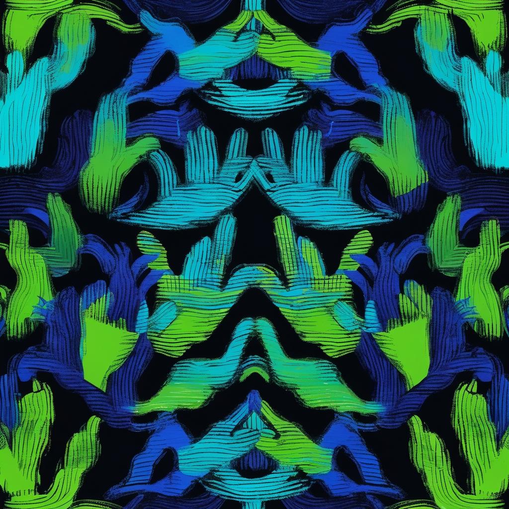 这幅作品以其简单的手掌轮廓和丰富的色彩渐变呈现出一种童趣的魅力。手掌作为一个具有普遍意义的符号,常常被用来代表创造力和探索的无穷可能性。在这幅画中,彩色的线条从绿色过渡到蓝色,仿佛在诉说一个关于成长与发现的故事。这样的作品让人不禁联想到童年时光中无拘无束的涂鸦,那种纯粹的创作欲望是每个成人都曾拥有的财富。通过在每个手掌中加入不同的纹理或图案,这幅作品可以进一步探索个体的独特性和多样性。背景的深色调不仅让前景的线条更加突出,还为作品增添了一层神秘感。现代艺术中,如何将简单的元素赋予深刻的意义一直是艺术家们追求的目标,这幅作品在这一点上提供了一个很好的例子。通过引入自然或文化符号,艺术家可以将个人的成长经历与更广泛的社会文化联系起来,使作品在观众中产生更深的共鸣。